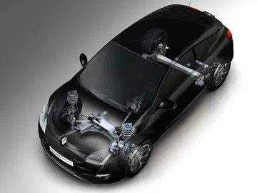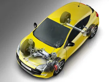 El chasis de serie tiene especificación Sport, deportivas pero no radicales. Si lo que buscamos es precisamente eso, radicalidad, podemos acogernos al chasis Cup, que puede incluir como opción el diferencial de deslizamiento limitado. La geometría de la suspensión deriva del Renault Mégane Sport II de 2004, con las lógicas mejoras como elementos realizados en aluminio, y es un tanto diferente a la de sus hermanos de gama. Con respecto a la suspensión del Mégane Coupé TCE 180 CV, en el chasis Sport los amortiguadores y muelles tienen además un tarado específico y la barra estabilizadora es de mayor diámetro. Más de lo mismo ocurre con el chasis Cup frente al chasis Sport, con el añadido del diferencial opcional del fabricante GKN tarado al 35% que permite conseguir una mejor tracción y agarre en curva.