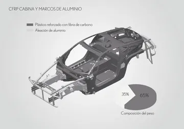 En el proceso de producción de la carrocería se han empleado materiales plásticos, reforzados con fibra de carbono. Además de una ligereza excepcional se consigue una elevada rigidez para el habitáculo, que lo protege en caso de accidente; aluminio es el material empleado en la zona del propulsor y las partes deformables. El sistema de escape está fabricado en titanio, unas válvulas se abren a partir de las 3.000 rpm y consiguen ese aullido que nos pone los pelos de punta, evocano a los Fórmula 1.