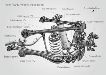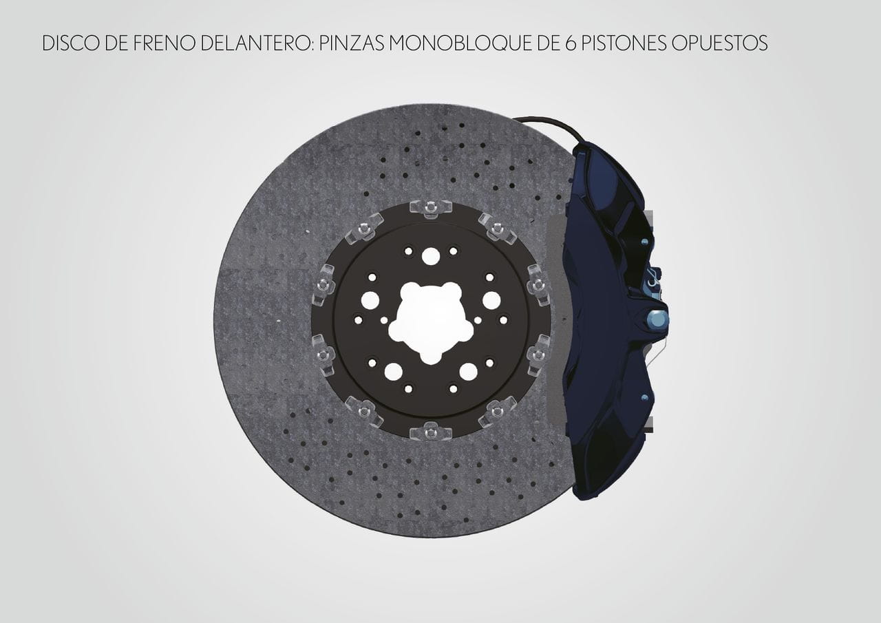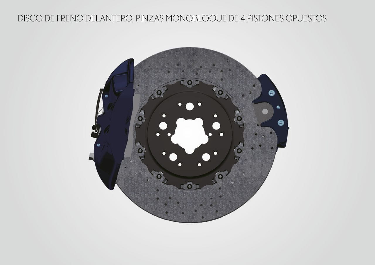 El reparto de pesos es 48:52, combinando la agilidad de un motor central con el guiado preciso de un motor delantero. Tanto batería, radiadores y depósito de combustible se encuentran junto al tren trasero, ayudando a inclinar la balanza hacia este. El énfasis en una dinámica fuera de serie también se aplica al equipo de frenos de alto rendimiento, compuesto por discos carbono-cerámicos (CCM). En el eje delantero miden 390 mm de diámetro y están abrazados por pinzas de seis pistones.