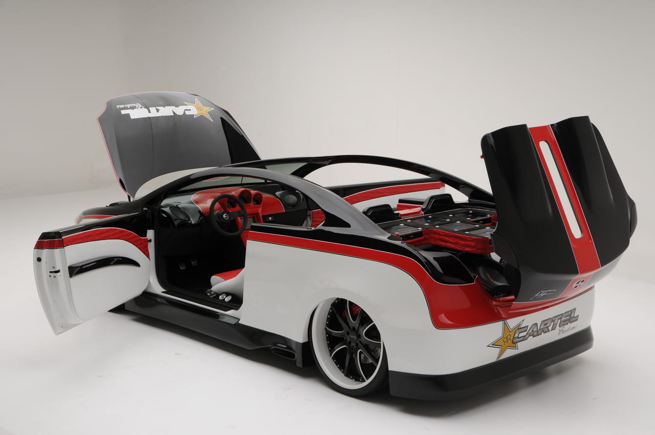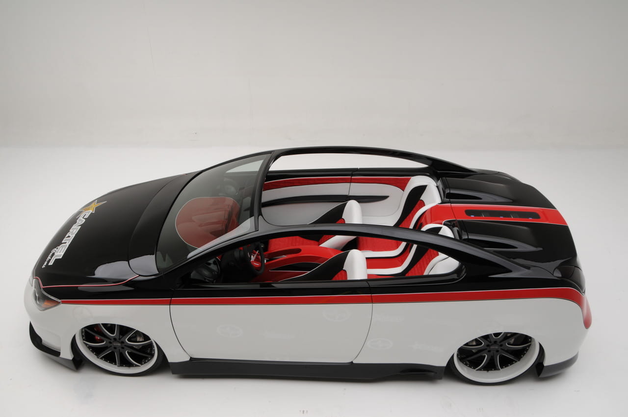 Una de cal y otra de arena el espectáculo lo completa el Epic Cartel Scion tC, una versión sin techo del coupé de Scion que lejos de integrar un techo de lona desmontable, prescinde por completo del techo y de los pilares centrales para conservar únicamente el arco del propio techo, en fín, un vehículo no apto para los días de lluvia.