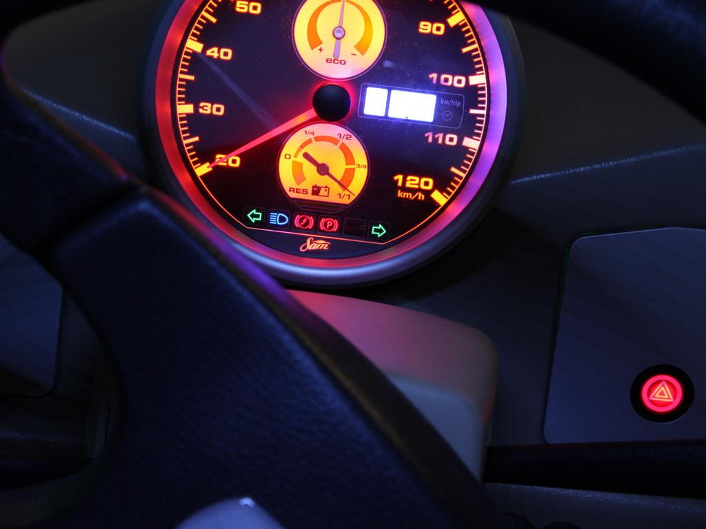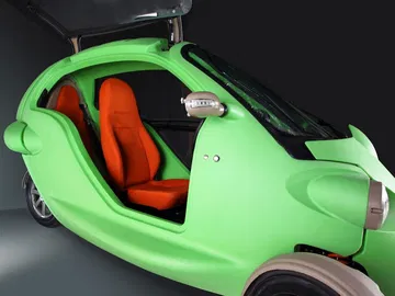 Se trata del Impact Re-volt, un peculiar biplaza eléctrico urbano de tres ruedas con un aspecto de lo más naïf. Mide 3,07 metros de largo por 1,58 metros de anchura y permite desplazarse a dos pasajeros sentados en disposición longitudinal y que acceden al habitáculo por puertas tipo alas de gaviota. La propulsión corre a cargo de un motor eléctrico de 15 CV que actúa sobre la única rueda trasera alimentado por los 7 kWh. de electricidad almacenada en un pack de baterías de litio ubicado tras los asientos.