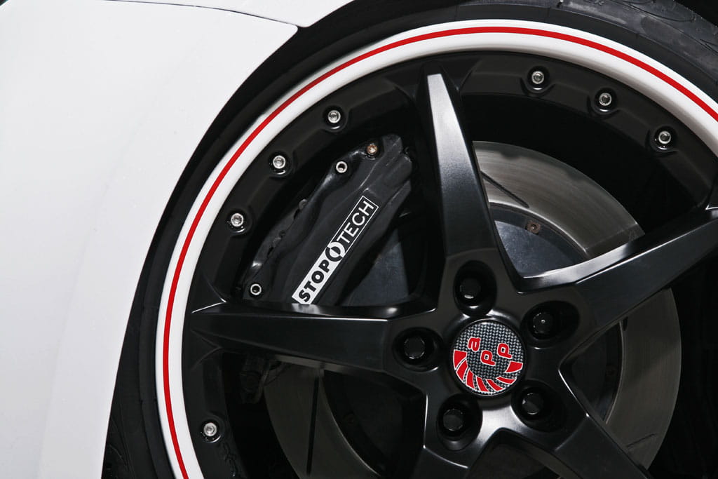 Las llantas dejan ver con claridad los frenos de alto rendimiento, fabricados por Stoptech. Para el eje delantero cuenta con discos de 380 milímetros y pinzas de seis pistones, mientras que atrás se conforma con discos de 355 milímetros y pinzas de cuatro pistones. El comportamiento dinámico y el aspecto estético se ve mejorado con una suspensión KW variante 3, de tipo roscada, que rebaja la altura del coche en 30 milímetros.
