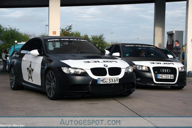 Tal y como ya habeis podido comprobar en las imágenes los vehículos utilizados son un BMW M3 (E92) y un Audi S3, ambos decorados en blanco y negro y con vinilos que les hacen parecer dos espectaculares vehículos policiales, similares a los que popularizó el extravagante Alexander Roy, y su equipo Team Polizei del rally Gumball 3000 que hasta 2007 recorría Europa todos los años poniendo en jaque a las autoridades.
