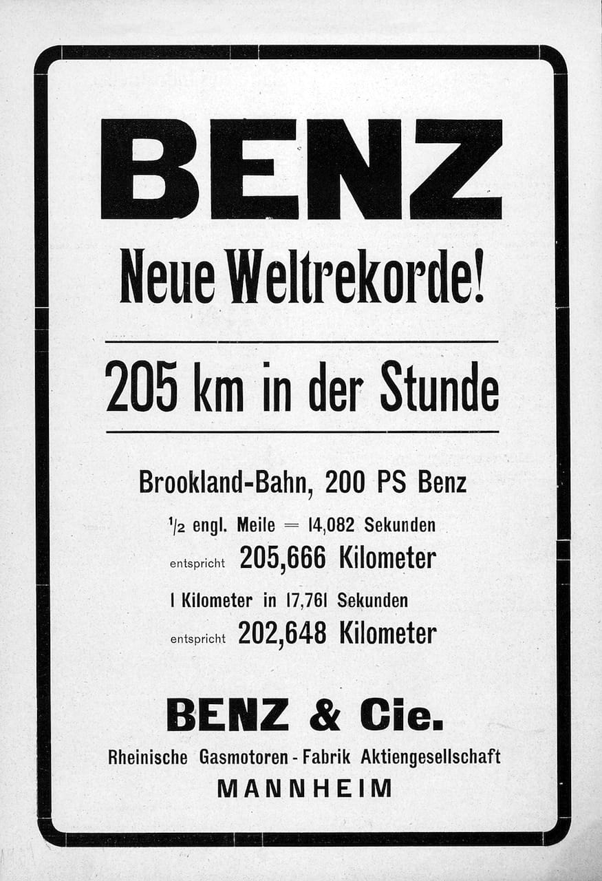 En una pista de cemento creada en Brooklands, Reino Unido, el Lightning Benz pilotado por Victor Hémery fue capaz de acelerar hasta alcanzar esa velocidad gracias a un enorme motor de gasolina de 21.5 litros de cilindrada y una potencia de 200 CV. No eran tiempos de downsizing y menos si se pretendía marcar un récord de velocidad.