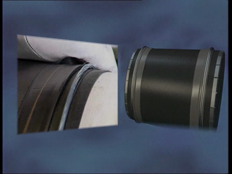 El primer componente que se imprime sobre el tambor para crear los neumáticos sin cámara es la goma interior. Ésta debe ser estanca al aire y al agua para que no existan filtraciones en el interior del neumático. A continuación se incorpora la lona de carcasa de forma transversal y a cada lado de la lona se colocan los aros metálicos que darán firmeza al neumático.