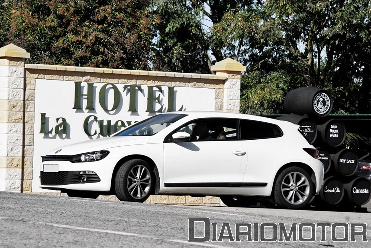 Bajé al parking enfrente de casa y allí estaba la bestia con su mirada desafiante: un Volkswagen Scirocco 2.0 TSI, que habíamos recogido la tarde anterior para la ocasión. Estaba limpito, con el depósito lleno y preparado para mordernos en cualquier momento. Nada más pulsar el botón de apertura del vehículo, se le encienden las increíbles luces de Xenón, con ese tono azul tan característico, y unos pequeños LEDs que tiene bajo los faros delanteros. Me habría gustado quedarme dando una vuelta alrededor del coche y fijarme en esa silueta atlética que tanto me gusta y en su estética, pero no hay tiempo; probablemente pueda hacerlo más tarde. Sin perder un minuto, ponemos el motor en marcha y salimos camino de Jerez.
