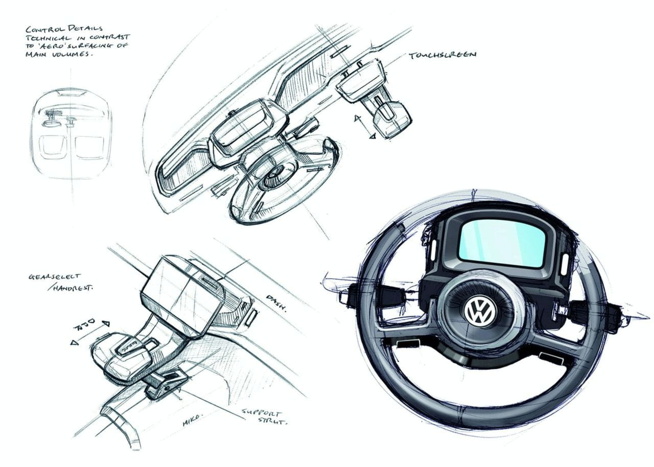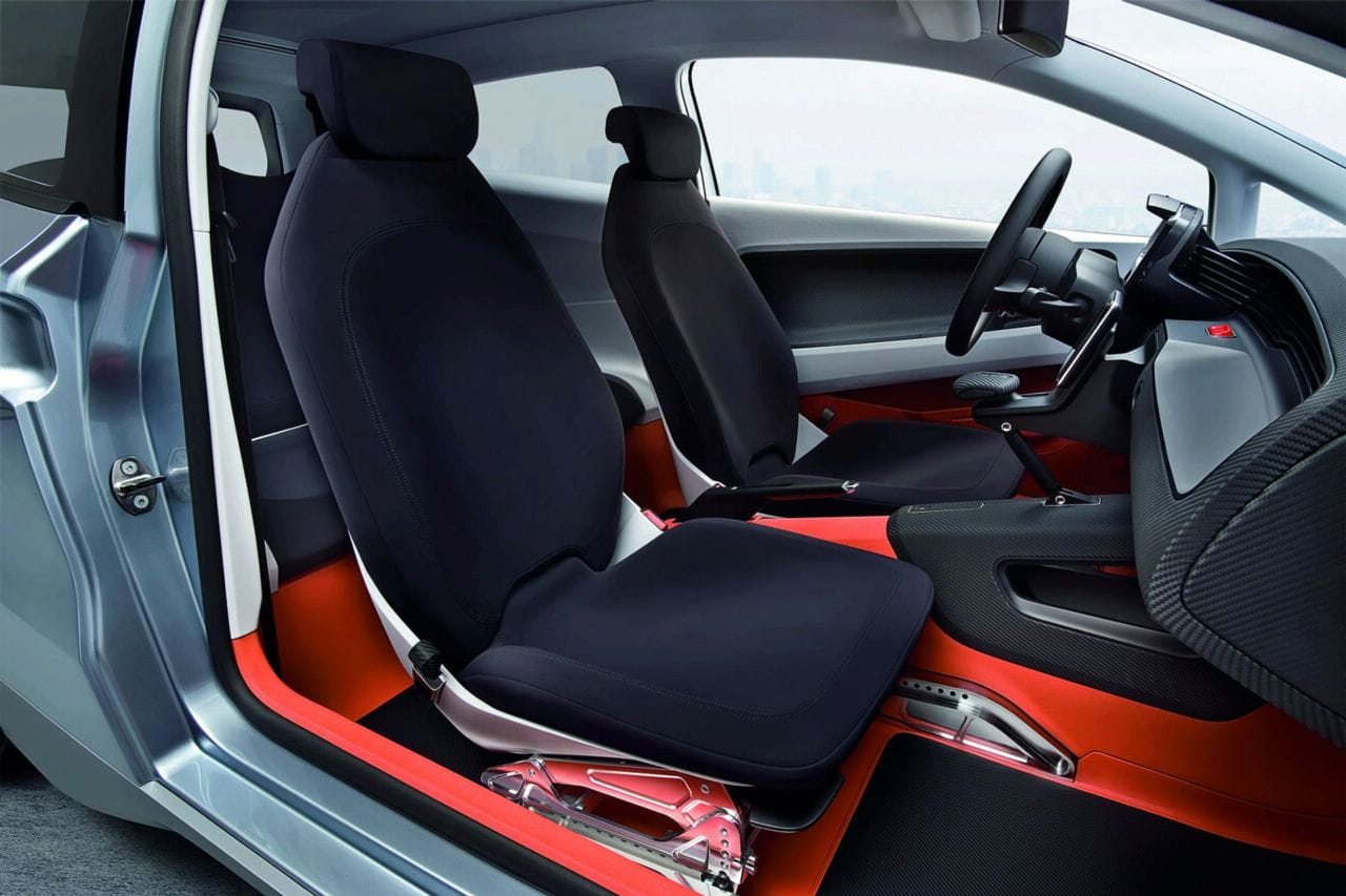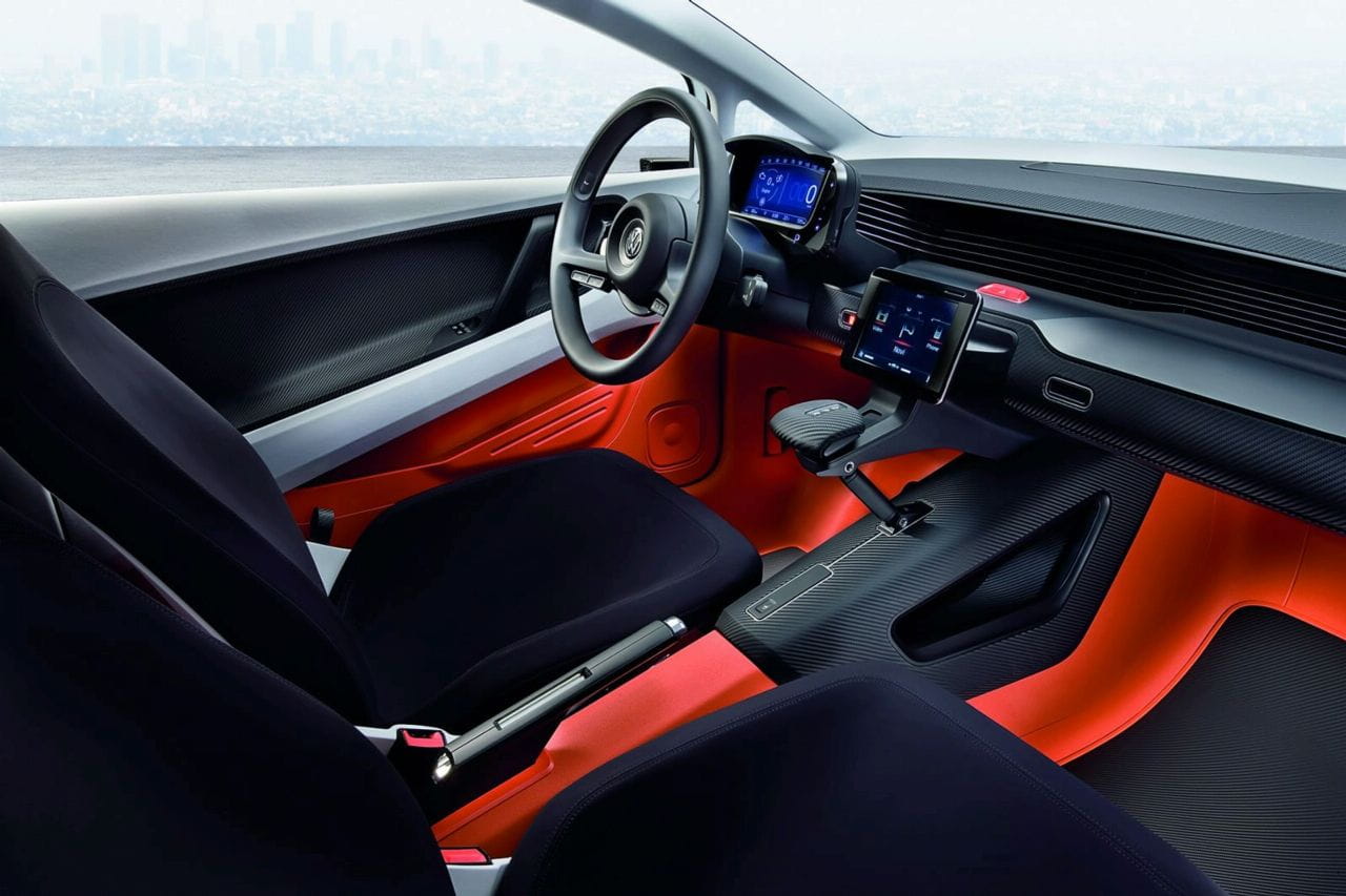 Otra de las peculiaridades de este urbano es la ausencia de espejos retrovisores, son cámaras que se proyectar en las pantallas multifunción, eliminando la necesidad física y el perjuicio aerodinámico de los espejos. Pasemos a hablar ahora de la técnica de este Volkswagen, comenzando por la carrocería y chasis. El conjunto sólo pesa 695 kg gracias al uso extensivo del aluminio en su construcción. La fibra de carbono se ha empleado en el techo, reduciendo al mismo tiempo el centro de gravedad.