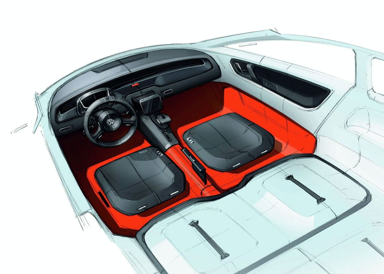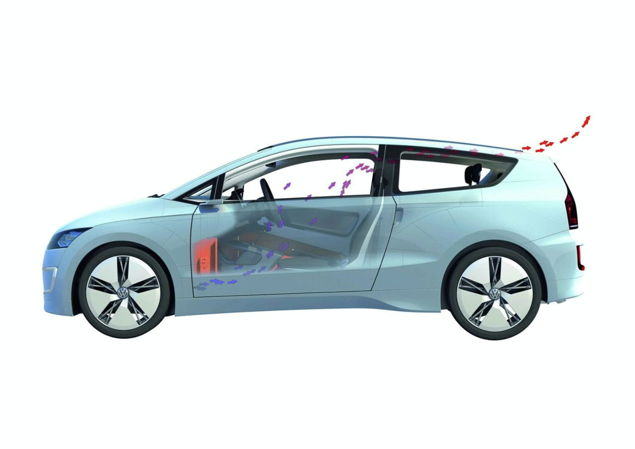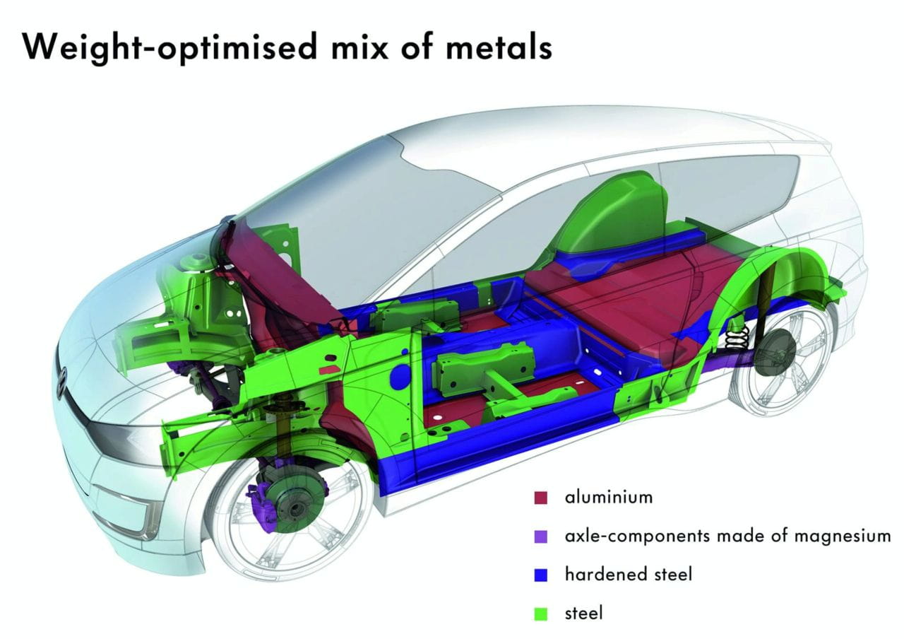 Otra de las peculiaridades de este urbano es la ausencia de espejos retrovisores, son cámaras que se proyectar en las pantallas multifunción, eliminando la necesidad física y el perjuicio aerodinámico de los espejos. Pasemos a hablar ahora de la técnica de este Volkswagen, comenzando por la carrocería y chasis. El conjunto sólo pesa 695 kg gracias al uso extensivo del aluminio en su construcción. La fibra de carbono se ha empleado en el techo, reduciendo al mismo tiempo el centro de gravedad.