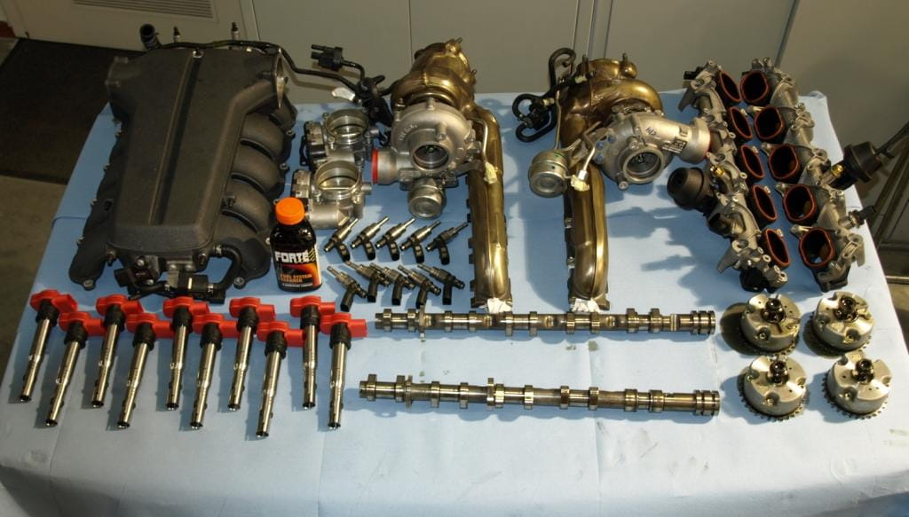 Más de un 60 % más de potencia no se saca precisamente de pinchar la centralita y ponerle un nuevo software, hace falta algo más que eso. Además de múltiples cambios físicos en los cilindros, mejora de la admisión y del escape, etc el corazón de este salto está en los dos turbos Garett de competición que pueden llegar a girar hasta las 230.000 rpm.