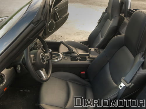 El interior del MX-5 no aporta un extra sobre el estilo de calidad de los Mazda en general, con un vistazo rápido sin conocer el coche se sabe la marca de procedencia. En el acabado Sportive el cuero es de serie para el tapizado de los asientos, que tienen en su esencia un intento de deportivos. El volante y la palanca de cambios también se visten de piel con una calidad que podríamos sentenciar como correcta.