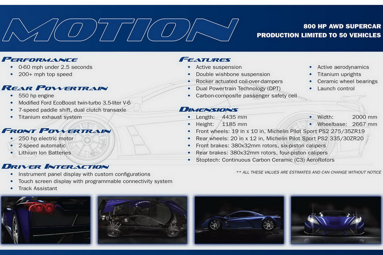 Las prestaciones que publican sus creadores son de infarto y ponen al Motion como un serio competidor del Bugatti Veyron. En perfectas circunstancias el Motion podría cerrar en los 2.5 segundos el 0 a 100 km/h y seguir acelerando hasta superar los 320 km/h. Para acercarse al Bugatti hace falta no solo potencia sino también un bajo peso.