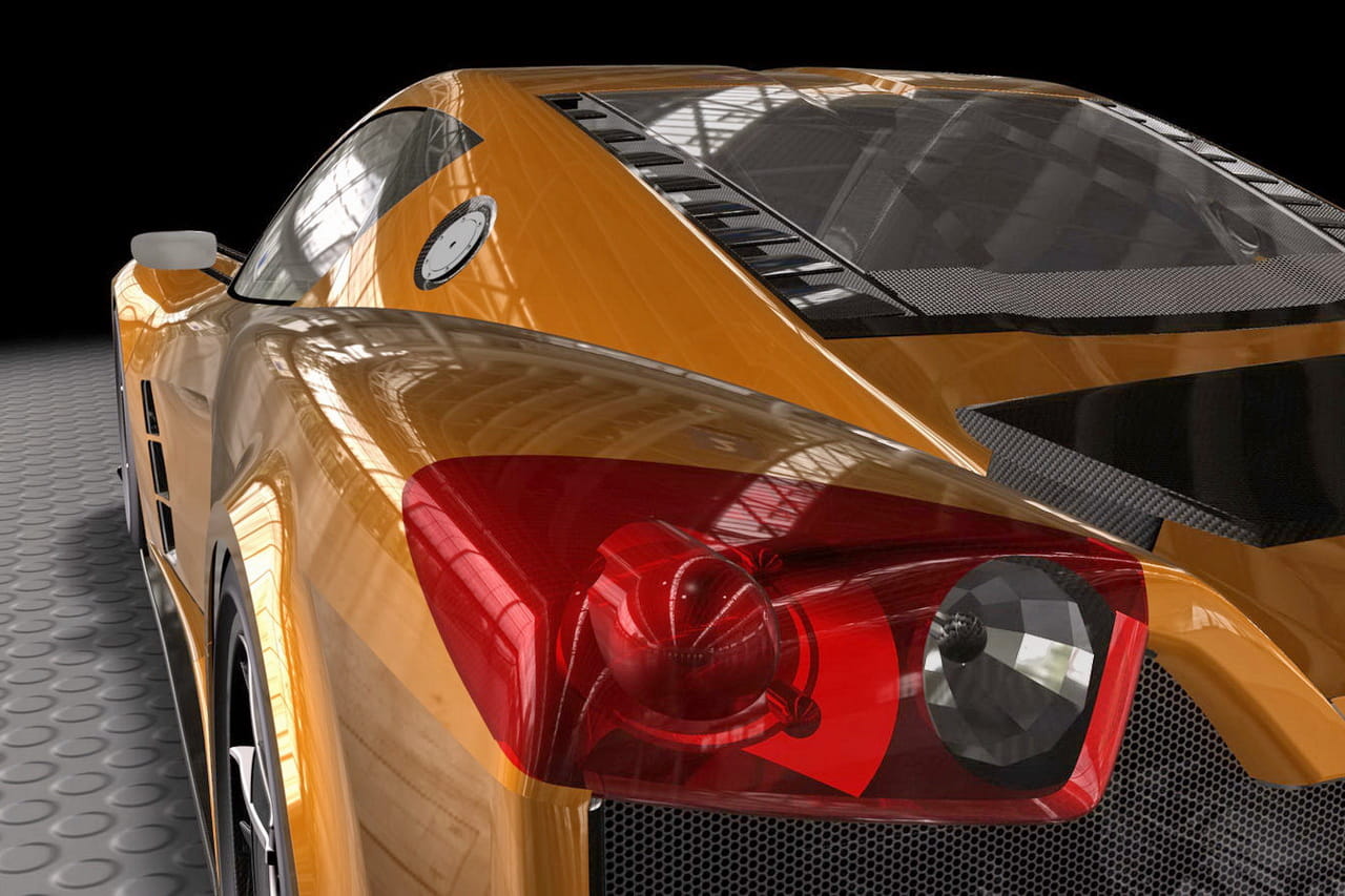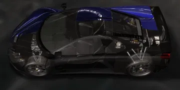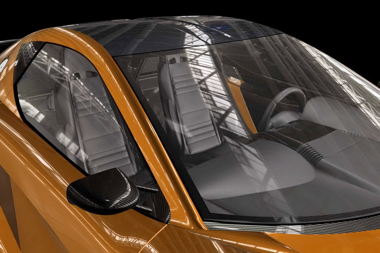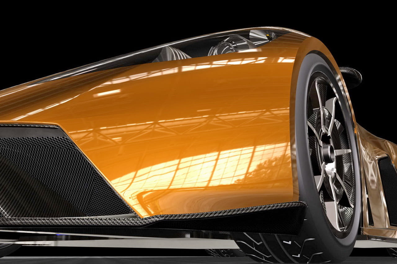 Mide 4.4 metros de longitud, 2 de anchura y sólo 1.19 metros de altura y ese volumen tiene un peso muy reducido gracias a materiales compuestos de fibra de carbono tanto en el chasis, en la carrocería o incluso en las preciosas llantas que calza. Su diseño es grácil y está lleno de esas curvas tan elegantes, parece que está copiado inspirado en el McLaren F1.