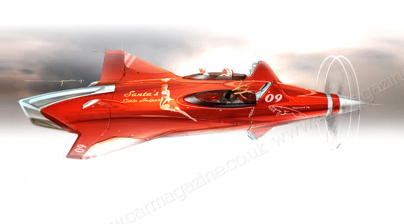 En CAR sugieren que el coche tiene un emblema “S1” en la parrilla y que podría tener tracción integral, aunque eso me parece una especulación demasiado exagerada. Hay que reconocer que tiene gracia ver a Santa Claus expresando su actitud de corredor de rallyes deprimido, en un guiño al glorioso pasado de Audi en los rallyes, creo que sabéis a qué me refiero. Jaguar también ha creado su particular trineo navideño, por lo que parece inspirándose en aviones de época con propulsión trasera.