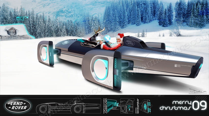 Como ya parece ser tradición la revista británica CAR ha encargado a diseñadores de Audi, Aston Martin, Jaguar, Land Rover y Opel el diseño de monturas navideñas para Santa Claus – o Papá Noel – en clave futurista. Dando rienda suelta a su imaginación los diseñadores británicos de Land Rover han creado un trineo que se propulsa mediante repulsores – al estilo Star Wars – y lleva un software especial de reconocimiento de chimeneas, ideal para el tradicional reparto anual de regalos.