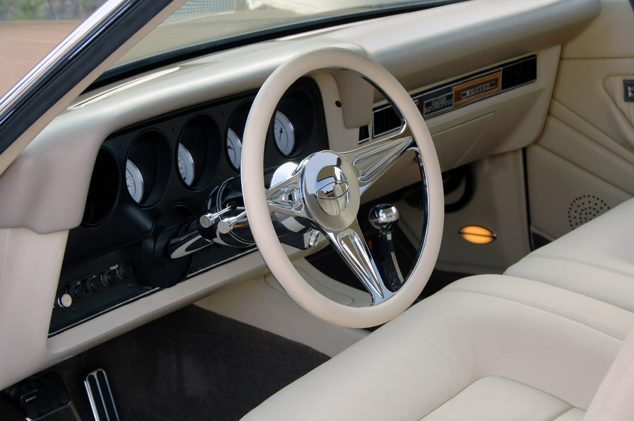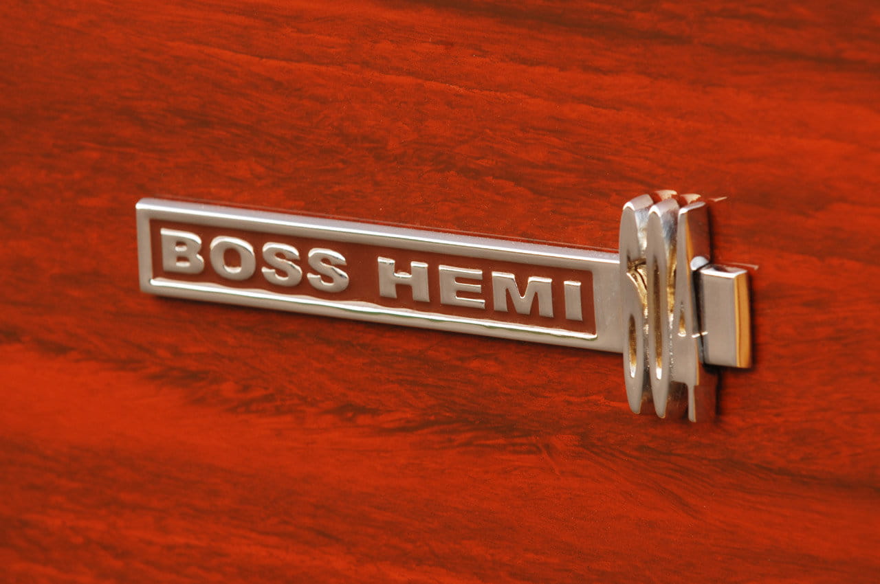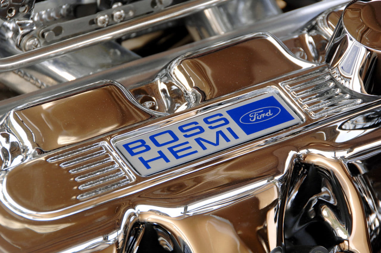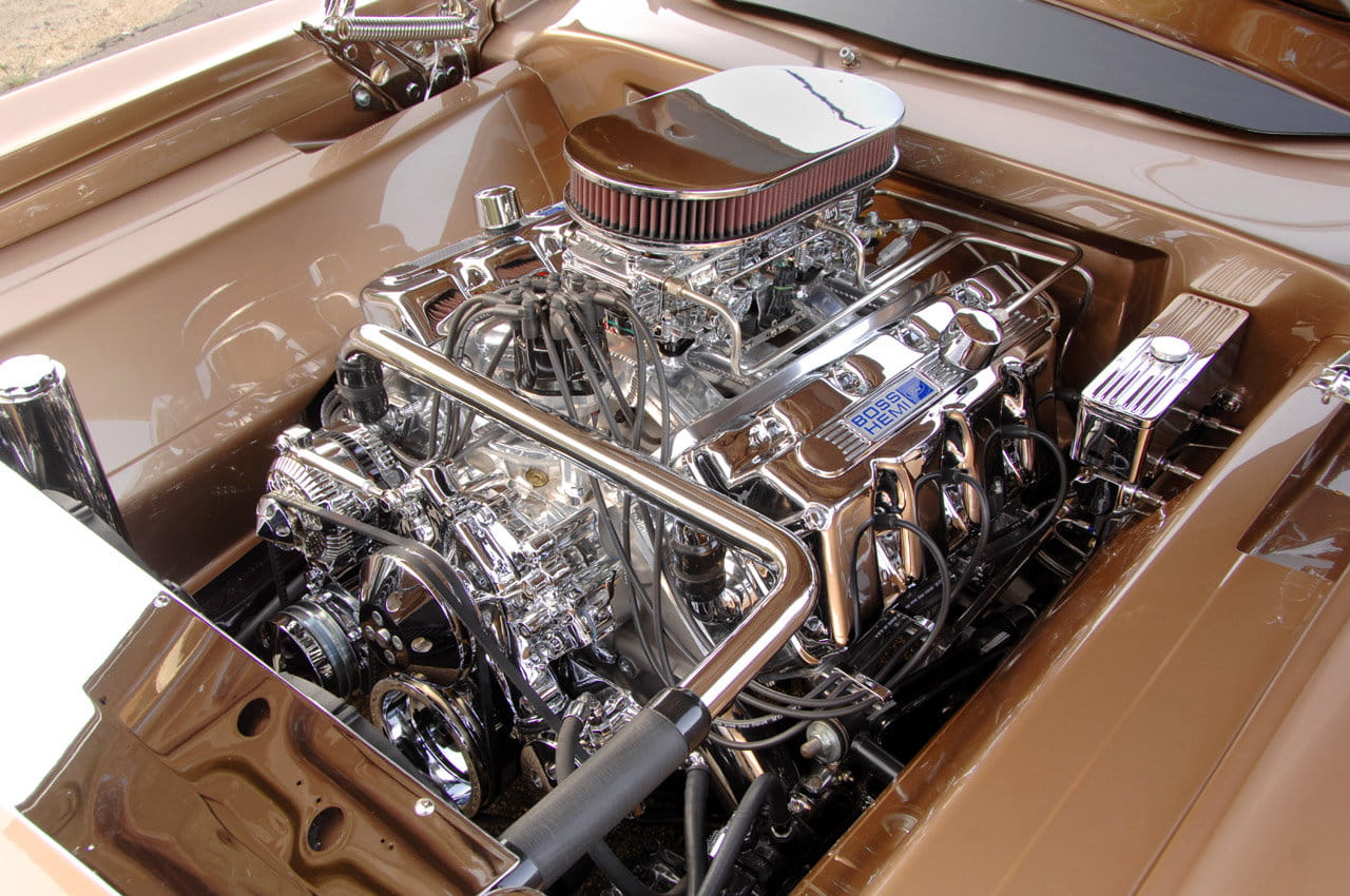 Su dueño lo tiene muy cuidado, pero se ha deshecho de su 5.8 V8 original, a pesar de que tenía 325 CV. Por contrario, ha instalado un V8 de 9.9 litros de cilindrada – 604 pulgadas cúbicas (ci) – construido por JBA-Engines sobre la base del Ford Boss-427, con partes de refuerzo de C&C Motorsports, Crowler y Manley. Combinando un doble carburador Holley con gestión electrónica y botellas de óxido nitroso la potencia de este monstruo es de 870 CV, mientras que el par motor es rompedor, 1.115 Nm.