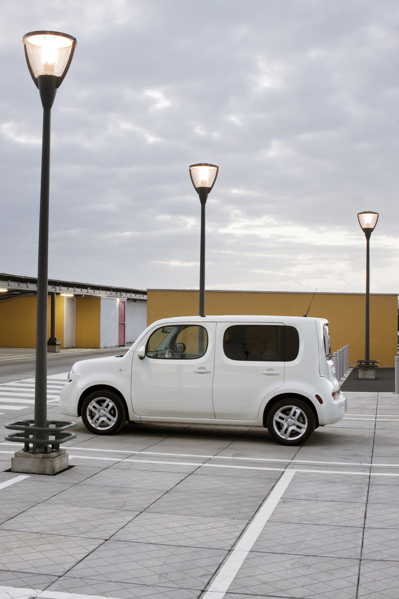 Es un coche que me ha gustado mucho desde que supe de la existencia, pues lo más parecido que hay en el mercado español es el Kia Soul. El Nissan Cube tiene otros elementos de diseño curiosos, como un frontal con una calandra de plástico transparente y dos faors de pequeño tamaño. El parabrisas está en posición bastante vertical, pues la máxima del Cube es un gran aprovechamiento en espacio interior y no una aerodinámica de campeonato (Cx de 0.35). En la zaga las ópticas se encuentran bajas, una banda con el emblema del coche las une.