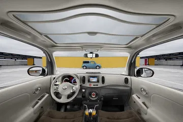 Los materiales empleados en su construcción parecen buenos, y los ajustes precisos. Nissan no destaca en interiores, pero nunca defrauda. El volante es multifunción y desde el mismo se maneja parte del sistema de infotainment Connect, que opcionalmente puede llevar navegador GPS táctil y cámara trasera de aparcamiento. De serie en toda la gama es el techo panorámico Shoji. Es fijo y una cortinilla lo ocluye si es necesario, esta permite pasar la luz pero no el calor, tan y como la planta japonesa de que toma el nombre.