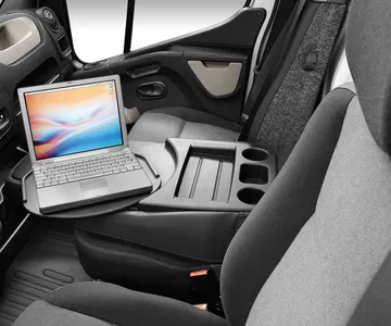 Otra de las novedades del interior de la Master es una pequeña mesa giratoria situada sobre el respaldo de la mesa central que puede dirigirse al conductor, muy útil ara trabajar con un portátil o escribir notas. Destacan también los huecos de la consola central que incluyen un hueco para bebidas y el cenicero extraíble. Sobre las cabezas de los ocupantes se encuentran tres compartimentos ya conocidos, dos laterales y uno central pensado para las gafas de sol.