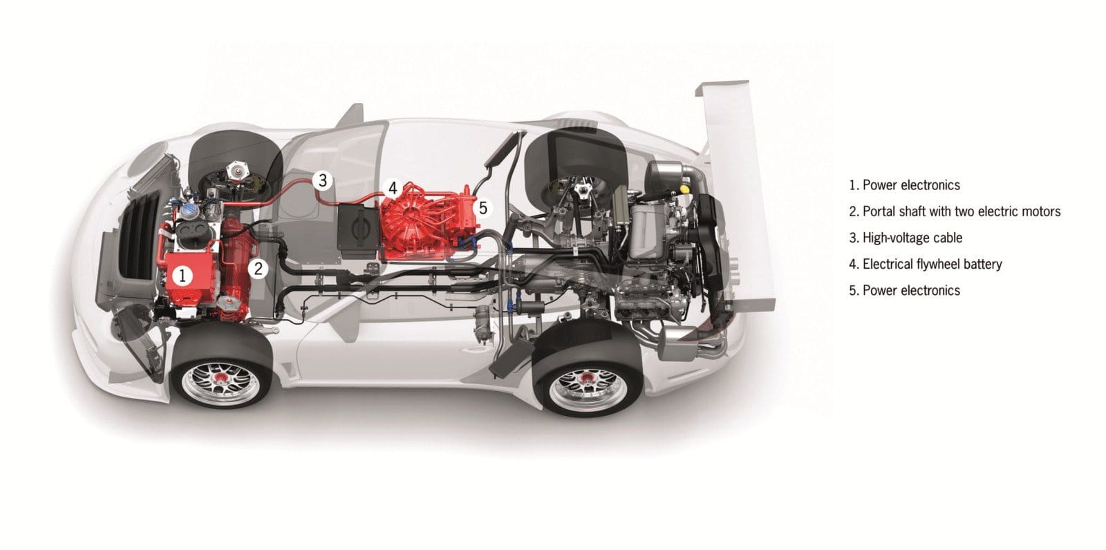 De todas formas, no estamos ante un híbrido al uso, sino más bien ante la aplicación del tan manido KERS (similar al visto la temporada pasada en la Fórmula 1) a un Porsche 911 de competición. El motor boxer, situado como es tradición sobre el eje trasero, entrega 480 CV, mientras que para el eje delantero cuenta con dos motores eléctricos que trabajan en conjunto para proporcionar 60 kW suplementarios por cada motor, 120 kW en total.