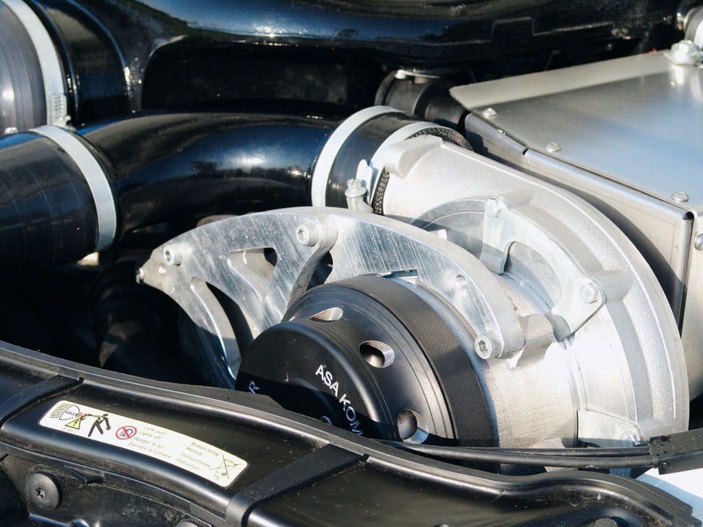 Si tuviéramos un M3 pero tan sólo nos interesase una pequeña ganancia en potencia máxima y un par algo mayor a cualquier régimen, la Stage I de Manhart propone un pequeño compresor soplando a 0.35 bar, para obtener 515 CV. En la Stage II, el compresor eleva la presión de soplado a 0.5 bar para conseguir 585 CV.
