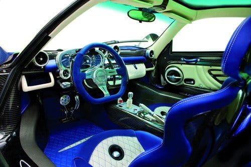 Al habitáculo también se ha trasladado la marea azul: los tapizados son de cuero teñido, aunque en combinación con la fibra de carbono desnuda y tonos blancos el resultado final no es nada desafortundado. Puede que sea un coche que se disfruta más desde su exterior si no somos el dueño, de lo contrario con darle al contacto ya seremos felices. Al estar basado en el Zonda Cinque, lleva un motor 7.3 V12 atmosférico de origen AMG que desarrolla la inmensa cifra de 680 CV, un guarismo que asusta.