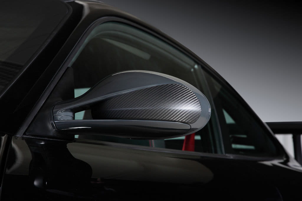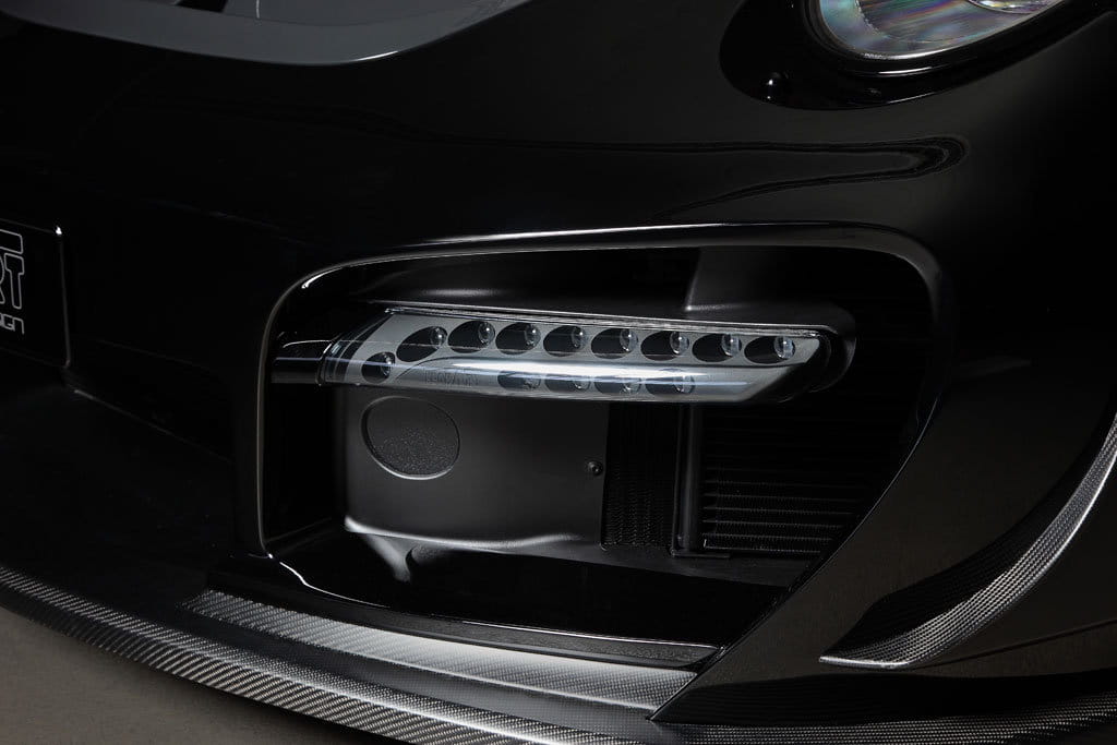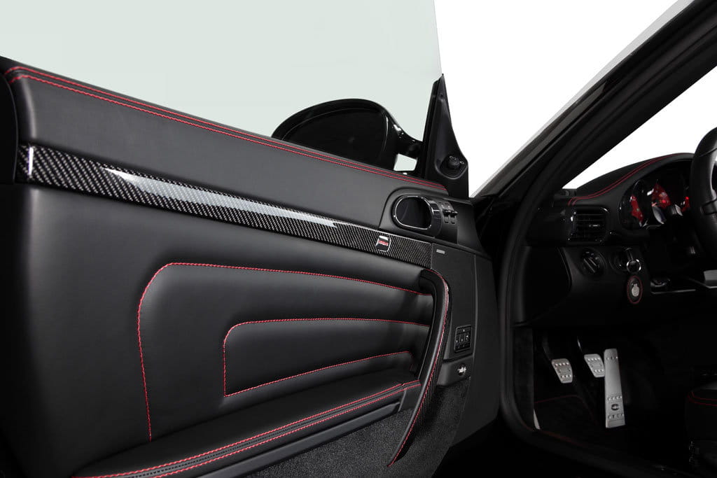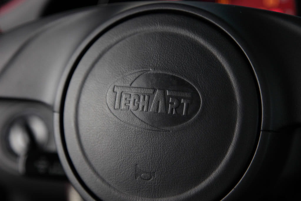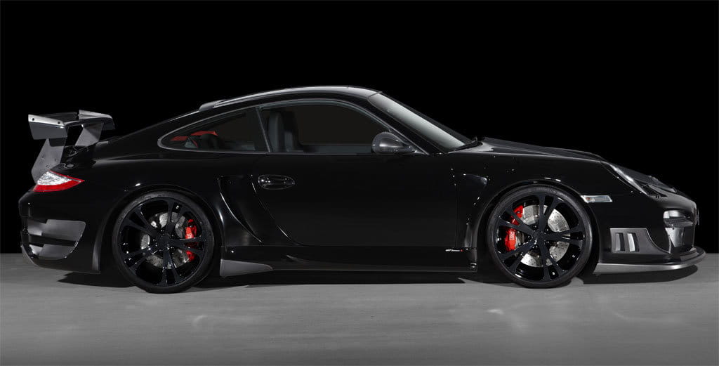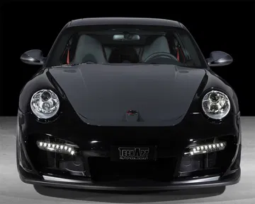 TechArt ha conseguido un hito al menos en lo que al aspecto del 911 Turbo se refiere: pintarlo todo de negro sin que quede demasiado “macarra”. Lo han vestido con unos salientes en el parachoques en fibra de carbono, protecciones laterales pronunciadas y unas llantas de aleación de 19 o 20” con acabado pulido gris, que hacen un juego “bárbaro” con el capó delantero. El diámetro más grande de llanta parece algo exagerado y parece que se “come” a los neumáticos.