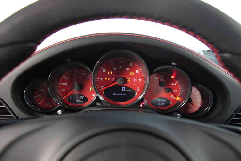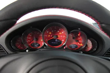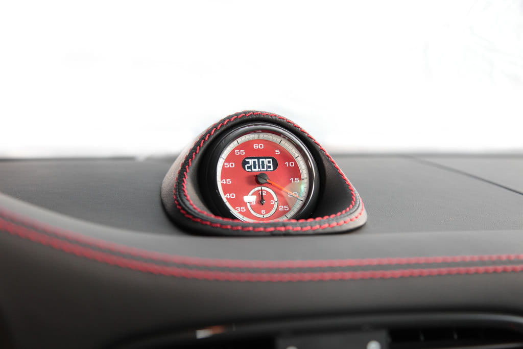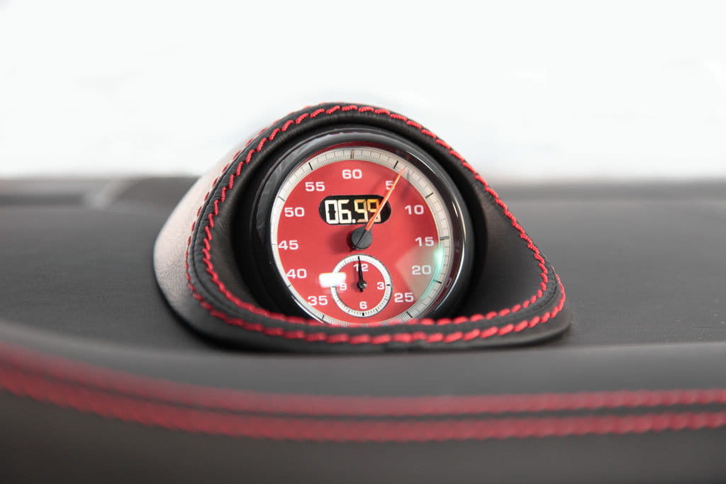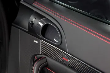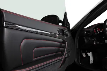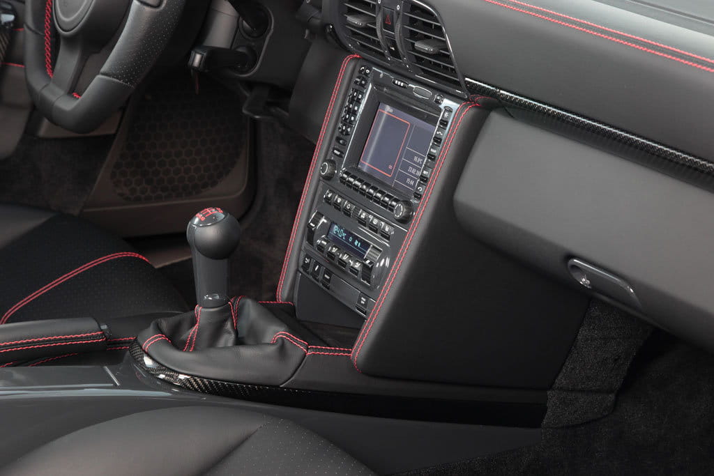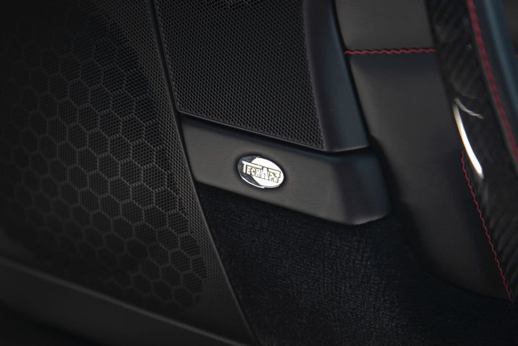 La piel de color gris con costuras en rojo llena el interior del 911 Turbo recorriéndose desde los asientos hasta las puertas o la consola central junto a inserciones en fibra de carbono y junto a los detalles en metal pulido, con el emblema TechArt insertado. La insignia “GT Street R” se hace un hueco en los umbrales de las puertas, en el reposabrazos central y en los nuevos diales con fondo rojo.