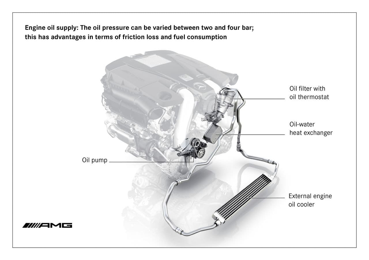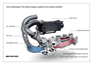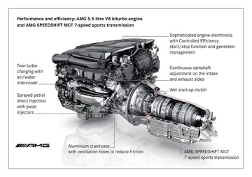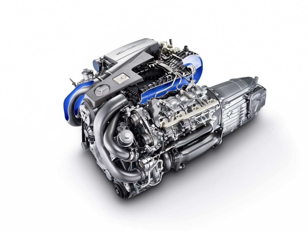Soplan a 1.0 bares o 1.3 bares con el kit de potenciación AMG Performance Kit, del que hablaremos más tarde. Llevan válvulas de descarga de nuevo diseño. La relación de compresión es de 10:1. Otra tecnología aplicada en el desarrollo del motor ha sido el alzado variable de válvulas. Una potente bomba mueve por todo el motor el aceite del cárter según las exigencias de potencia, 10.5 litros concretamente, previniendo que esta entre en los turbocompresores y reduciendo por tanto el nivel de emisiones. El motor pesa 204 kg en vacío.
