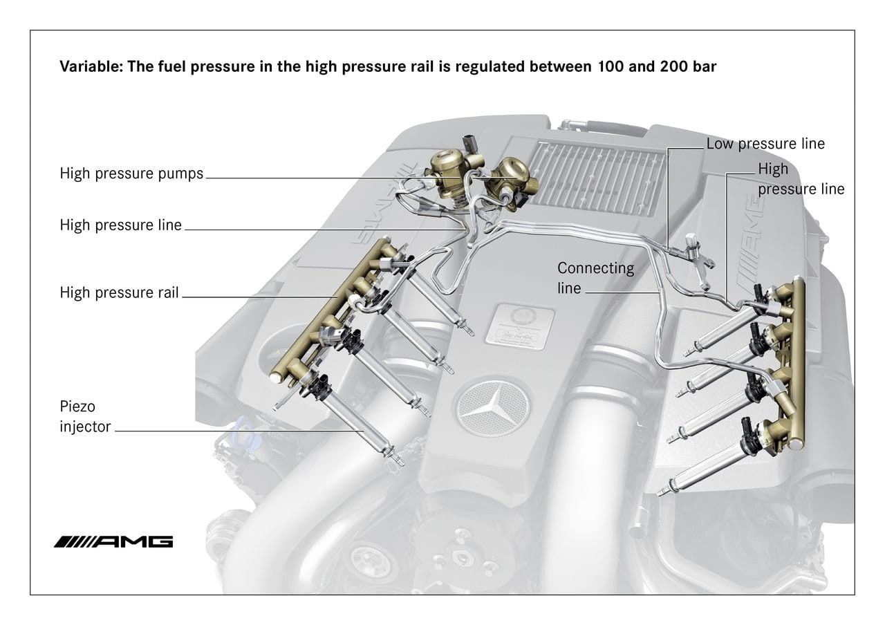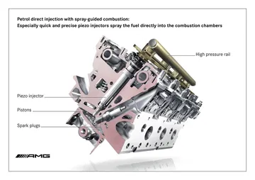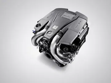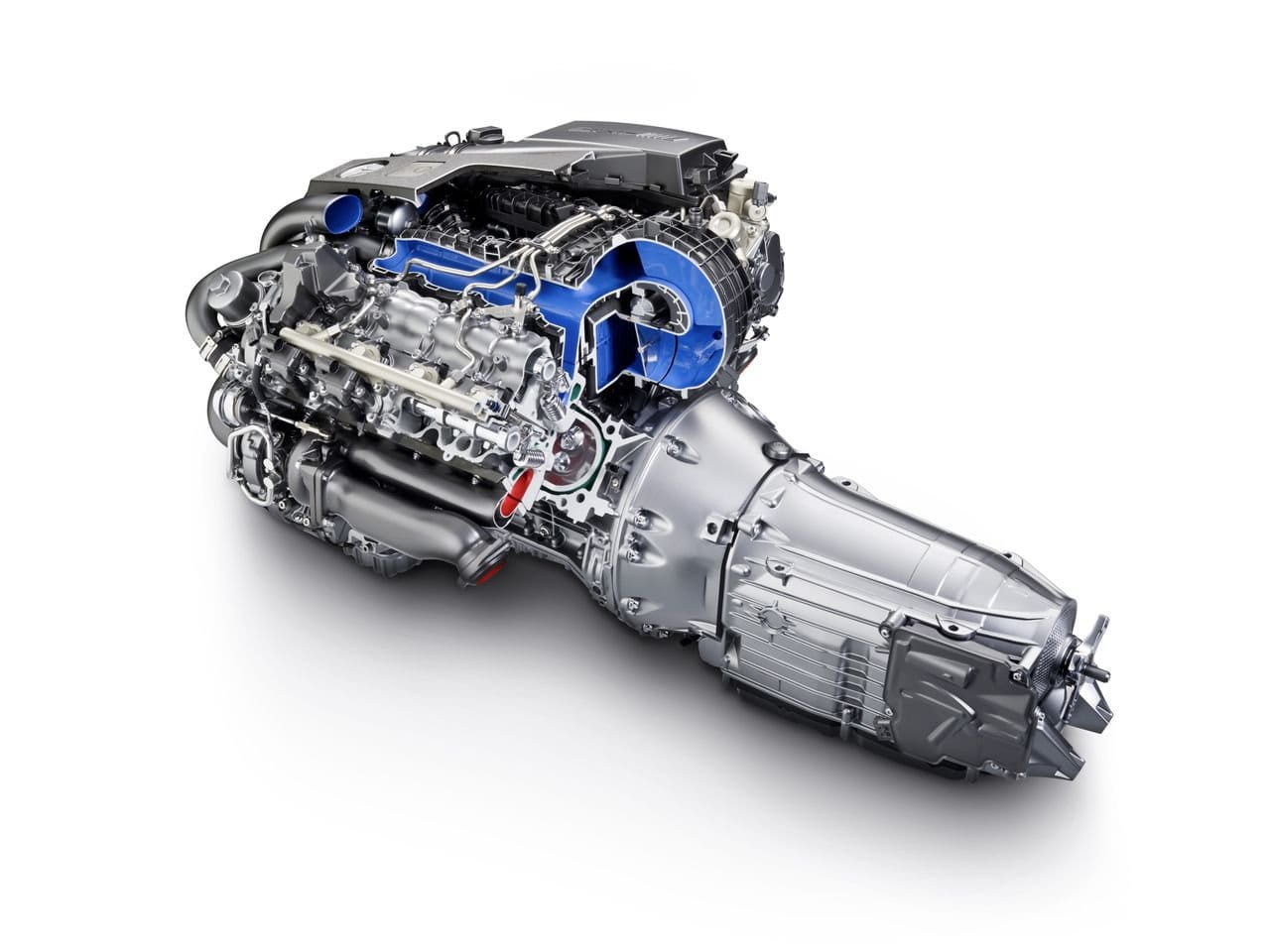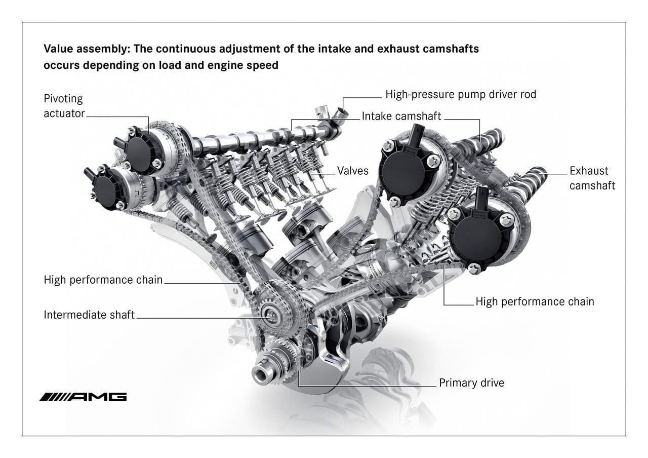 Soplan a 1.0 bares o 1.3 bares con el kit de potenciación AMG Performance Kit, del que hablaremos más tarde. Llevan válvulas de descarga de nuevo diseño. La relación de compresión es de 10:1. Otra tecnología aplicada en el desarrollo del motor ha sido el alzado variable de válvulas. Una potente bomba mueve por todo el motor el aceite del cárter según las exigencias de potencia, 10.5 litros concretamente, previniendo que esta entre en los turbocompresores y reduciendo por tanto el nivel de emisiones. El motor pesa 204 kg en vacío.