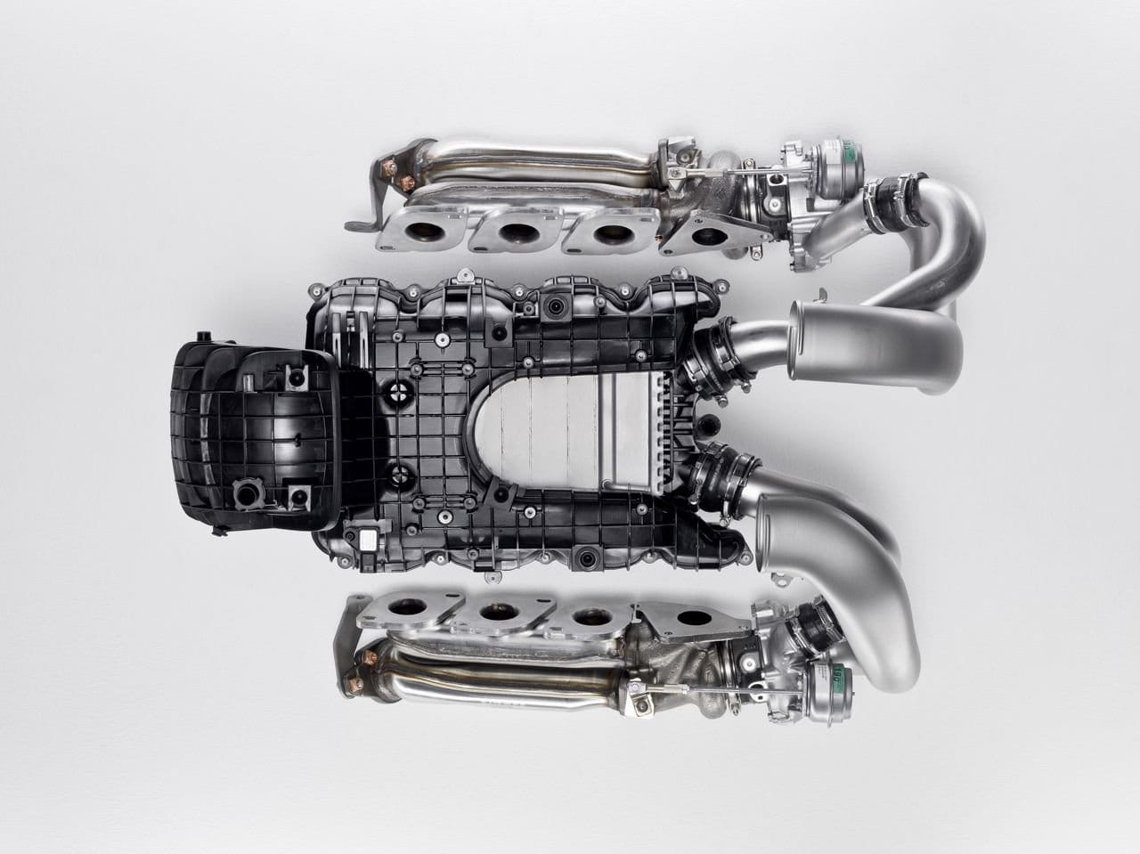 El nuevo 5.5 V8 biturbo tiene cuatro válvulas por cilindro y lleva dos árboles de levas en cabeza. El sistema de refrigeración es mediante un eficiente intercooler aire/agua que asegura la refrigeración del aire que entra en las cámaras de combustión. Los dos turbocompresores son de pequeño tamaño para un retardo mínimo (lag) a la hora de comenzar a funcionar y alcanzan una velocidad de giro máxima de 185.000 rpm. A plena carga llegan a meter en el motor nada menos que 1.750 kg de aire en una sola hora.