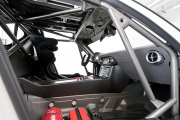 Las llantas, específicas de AMG para esta versión, son monotuerca y albergan potentes frenos en composite, con un ABS tarado específicamente. El interior hace énfasis en el aligeramiento de peso: únicamente los mínimos elementos indispensables, prescindiendo del lujo y confort del SLS AMG de calle. Cuenta con la obligatoria jaula de seguridad, asientos de tipo bucket con arneses de seis puntos o HANS. Por lo demás, el conductor piloto se encontrará con un cuadro de mandos que aportará únicamente la información precisa.