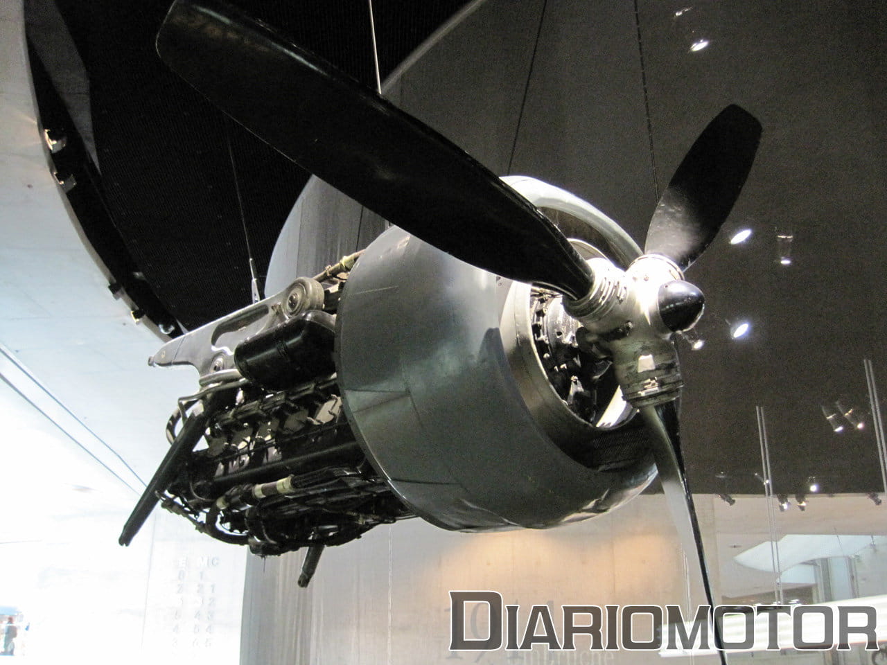 Algunos motores de aviación se encuentran colgados en el techo de esta sala, siempre sin hacer referencia a lo militar, salvo en un único caso, el DB 601 A, el primer motor con inyección directa de combustible de la historia. Se montaba en los Me 209, la tecnología estaba ideada para no perder rendimiento a mucha alturas y no ahogar el motor volando boca abajo o con grandes fuerzas G. Con doce cilindros y cerca de 34 litros de cilindrada, la potencia no era de más de 1.100 CV, entregados a 2.400 rpm.