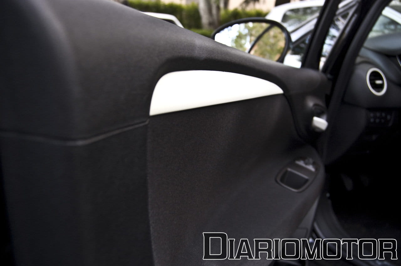 Por ejemplo el plástico brillante (demasiado brillante, tal vez) del embellecedor de las rejillas de la ventilación centrales, el soporte del navegador TomTom y del equipo multimedia es visualmente atractivo sin ser de una calidad extraordinaria. Las puertas por su parte también tienen tapizados en tela y algunas inserciones en plástico blanco.