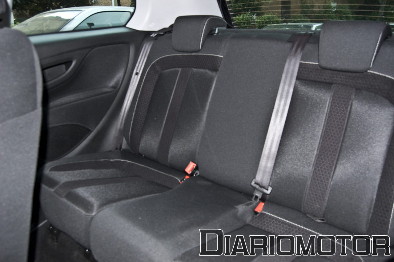 El acceso a las plazas traseras no presenta mayor problema que en cualquier otro utilitario de 3 puertas, como el Ford Fiesta o el Seat Ibiza Sportcoupé. En este caso son demasiado estrechas para tres pasajeros adultos y no sólo eso, de serie no se incluye el tercer reposacabezas central (es opcional) y aunque lo incluyese la plaza central tiene la base y el respaldo demasiado duros y no por llevar una bandeja central desplegable, que de hecho no la lleva.