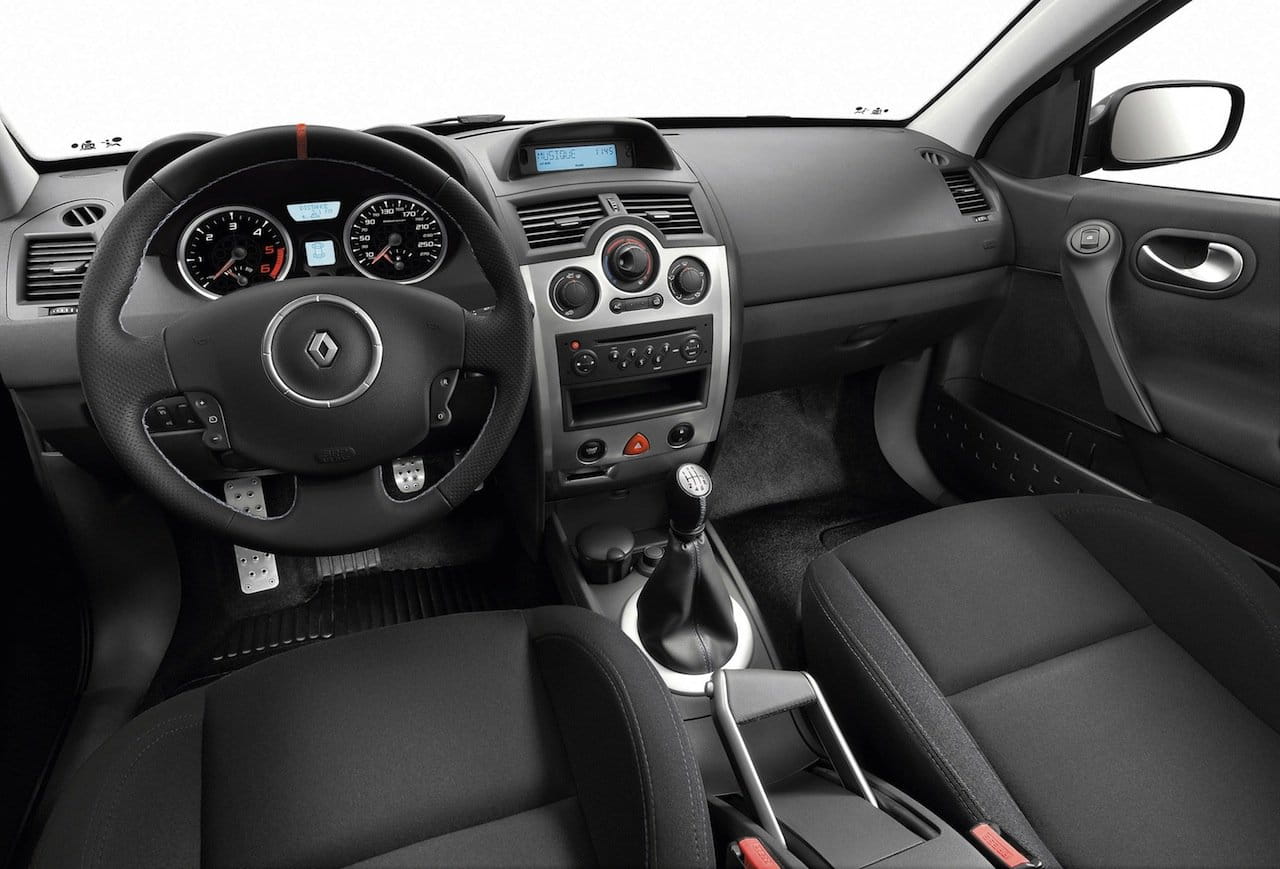 Empecemos pues, por este modelo de 2004 del Mégane RS. Este hatchback se ofreció en 3 y 5 puertas (para poder llevar a los niños al colegio con una sonrisa). Su aspecto exterior difiere de un Mégane normal, como es lógico. Lo más llamativo sin duda, es su paragolpes trasero con su doble escape central. Otros cambios en la carrocería fueron el paragolpes delantero, más bajo, sin molduras de plástico y con los antinieblas colocados fuera de la entrada de aire.