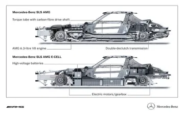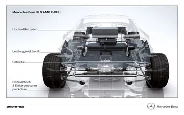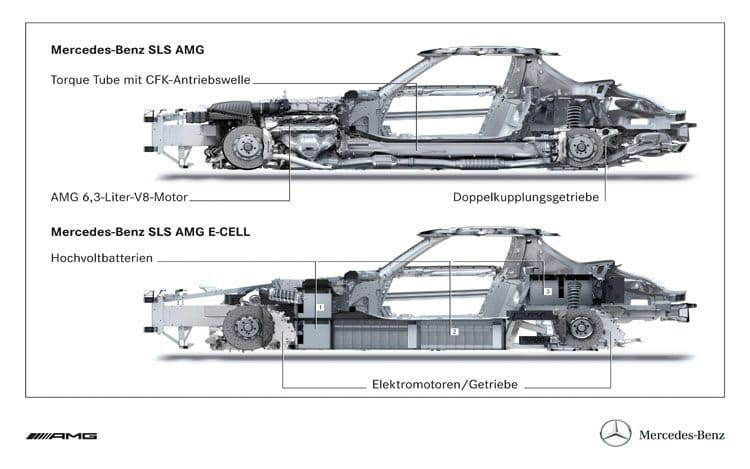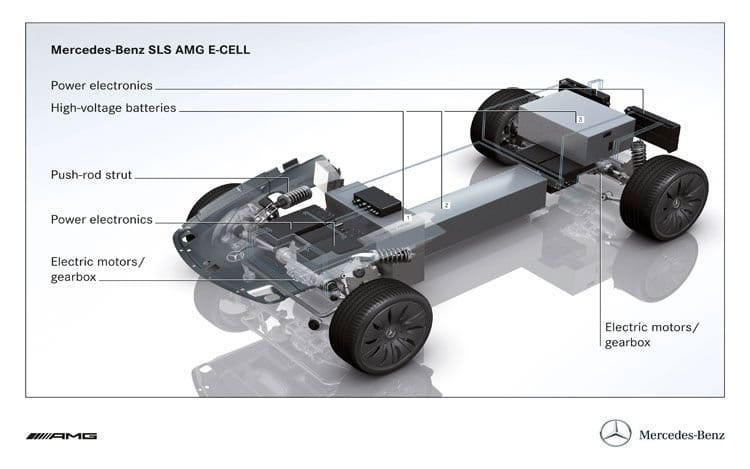 La batería cuenta con un sistema propio de refrigeración/calefacción que enfría y calienta el paquete de baterías de litio para conseguir en todo momento un funcionamiento óptimo y poder garantizar una entrega de potencia óptima en cualquier situación. Este prototipo está dotado además de los frenos cerámicos opcionales del SLS AMG.