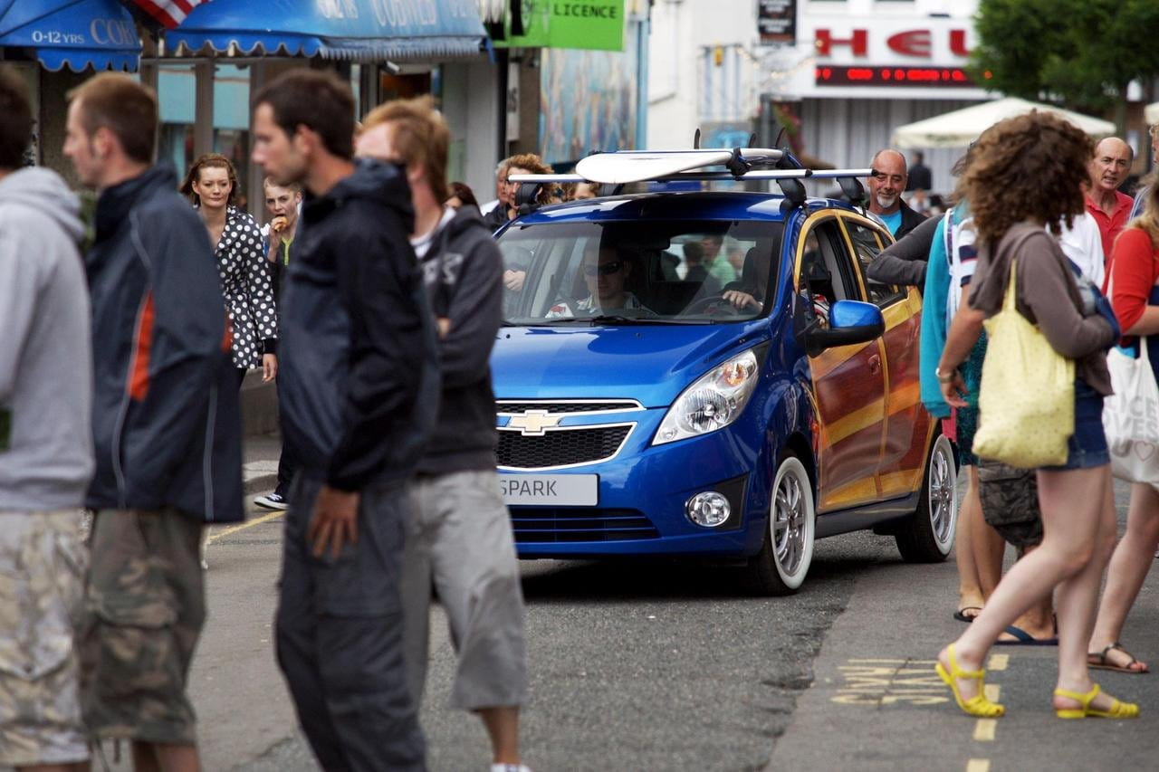 Una de las primeras paradas del Chevrolet Spark Woody será un festival de surferos, skaters y música. Y es que como habréis podido comprobar se ha incluido un porta-tablas de surf haciendo un guiño histórico a los amantes de este deporte. Las llantas cromadas y los neumáticos bicolor con los perfiles blancos tampoco tienen desperdicio.