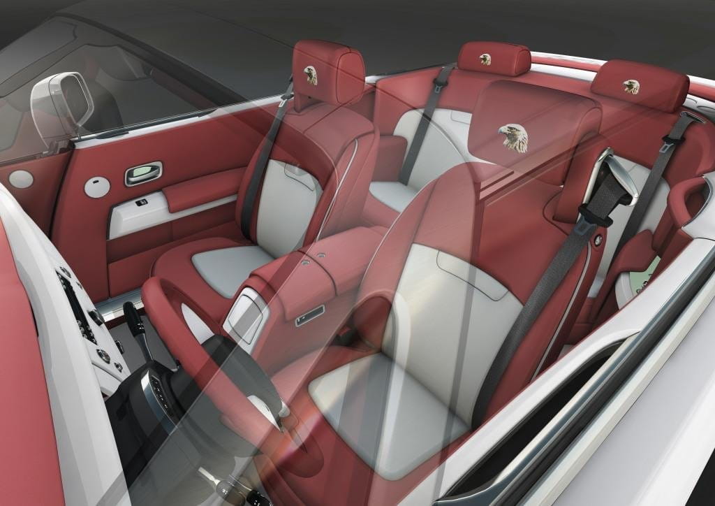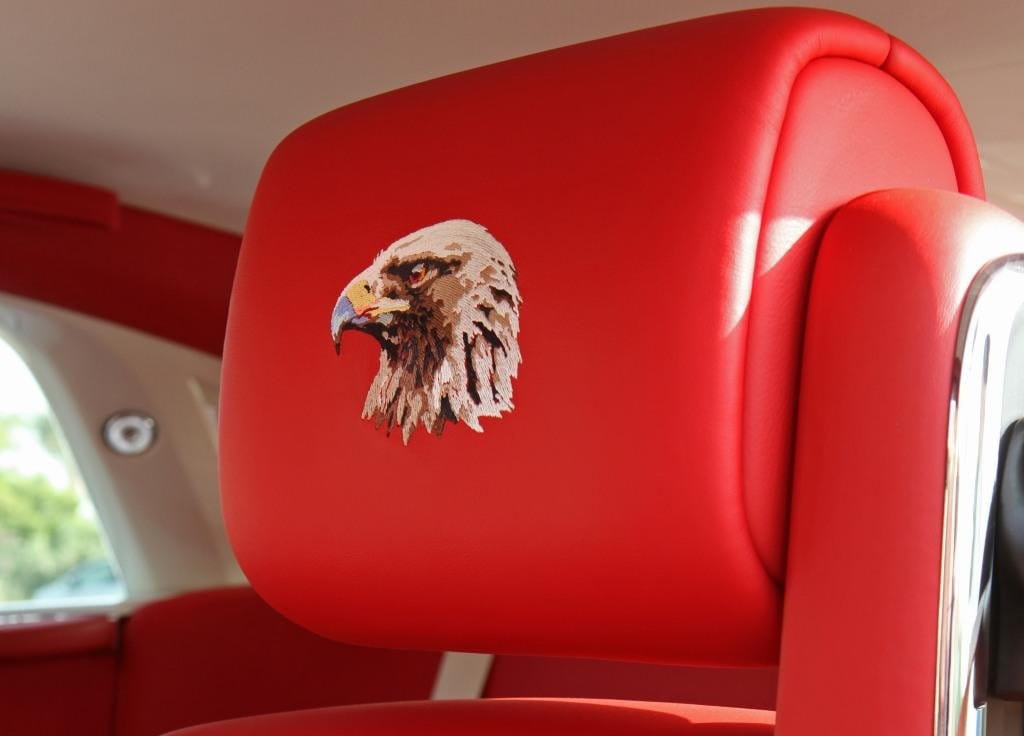 Shaheen es el nombre de otra de ellas basada en el Phantom Coupé y que rinde un cálido homenaje a los halcones. Casualidades de la vida, o más bien no, el halcón forma parte del escudo de armas de los Emiratos Árabes Unidos. Este precioso y rápido pájaro aparece bordado a mano en los reposacabezas de los asientos dentro de un interior que no pasa desapercibido gracias a sus colores rojo chillón Tudor y blanco.