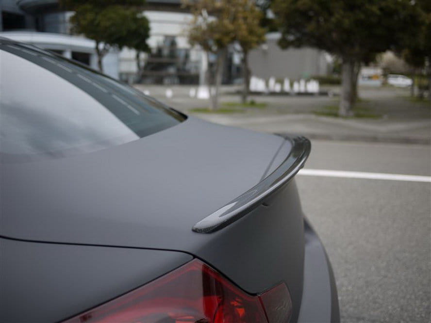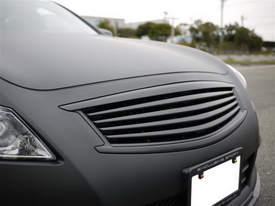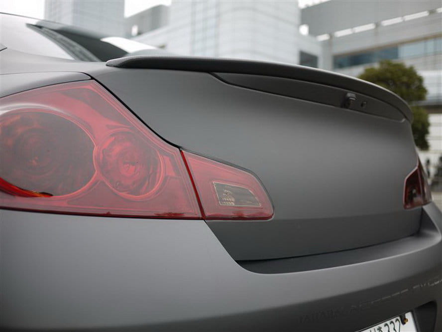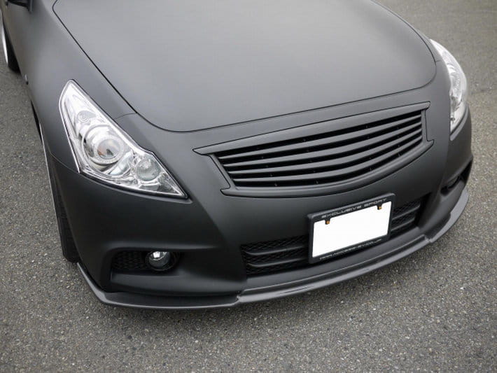 Negro que te quiero negro. El color de moda cuando está “barnizado” en mate es lo que lleva impuesto este G37 pero lo hace hasta las últimas consecuencias. No quedan sin tocar la calandra, ni la parrilla, ni los retrovisores… Solamente faltaba que hubieran tintado las ópticas para completar el asunto. Además lleva el sobresaliente spoiler delantero y el pequeño alerón trasero realizados en fibra de carbono.