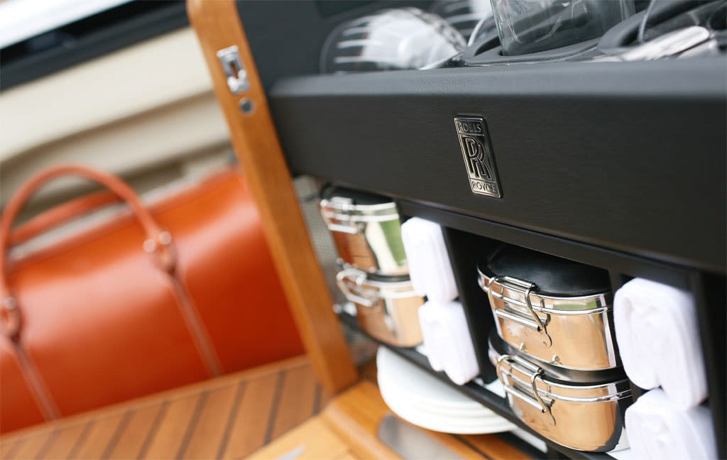 La madera de teca al óleo forma parte del entorno del habitáculo y como suelo del maletero. En él caben perfectamente los elementos necesarios para realizar un picnic de más alto nivel, incluyendo un juego de copas de champán, un completo conjunto de picnic realizado también en madera de teca y un pequeño compartimento refrigerado, situado bajo la planta del maletero, donde poner a temperatura perfecta el burbujeante líquido.