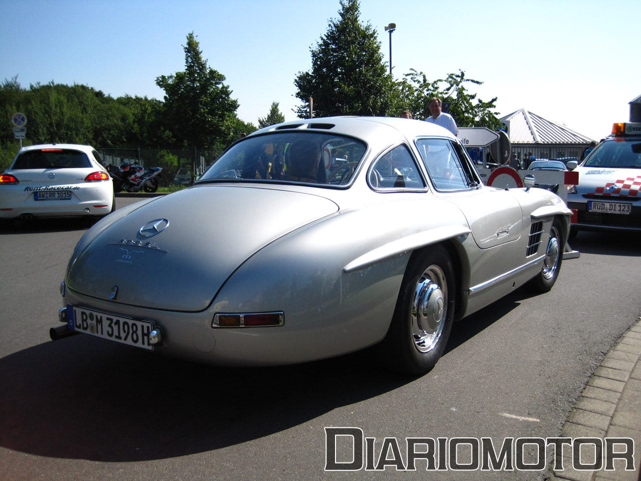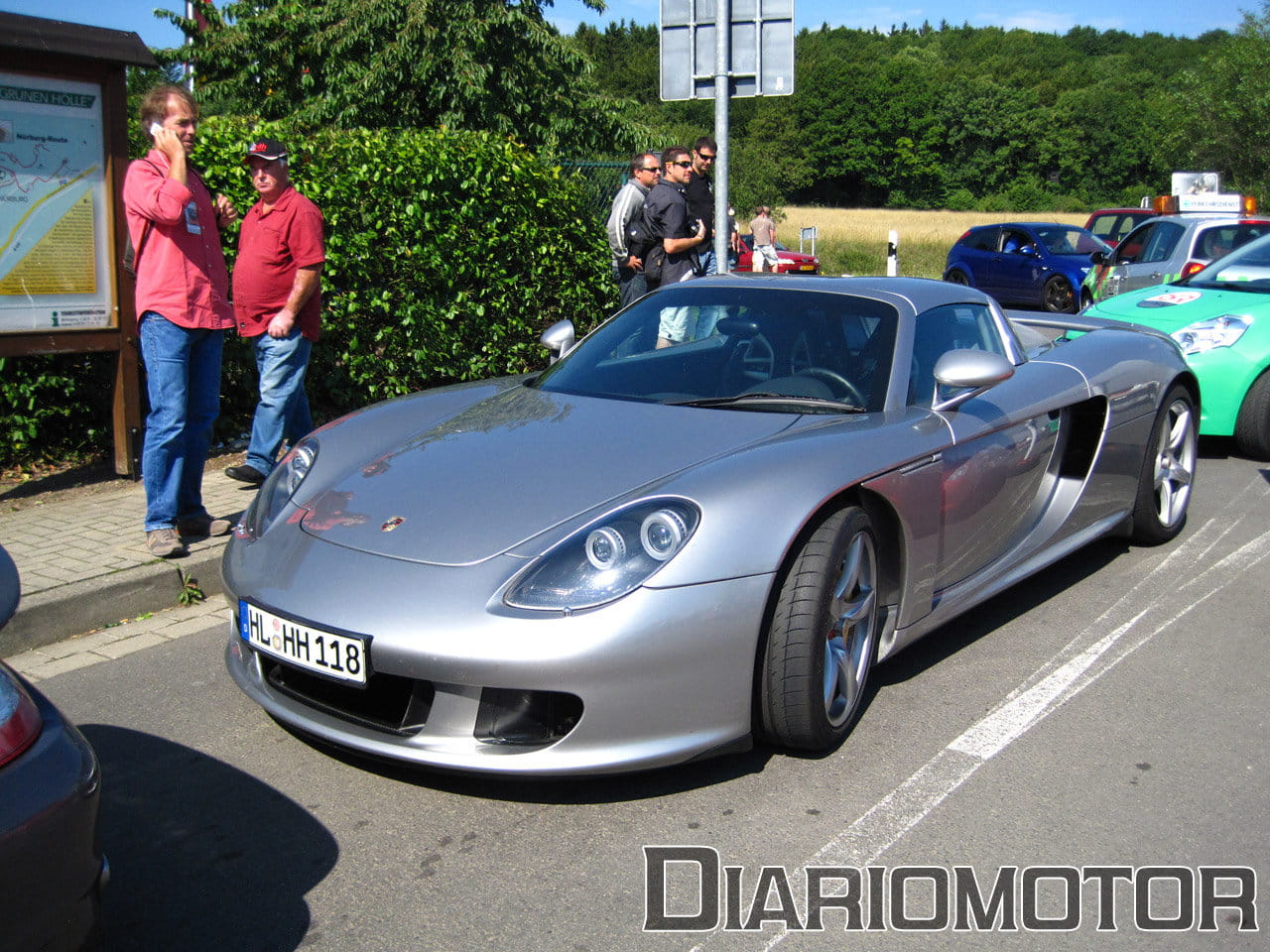 Tanto el 300 SL como el Carrera GT dieron una vuelta, pero no más, que son coches muy caros que no conviene arriesgar en el circuito más técnico del mundo. Si el 300 SL destacaba por su presencia y estado de conservación, el Porsche destacaba por su sonido, un aullido penetrante que emana de las entrañas de su 5.7 V10 derivado de la competición, capaz de desarrollar 612 CV de potencia y girar a regímenes cercanos a las 9.000 rpm. Es posible que llevase un escape modificado.