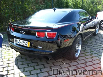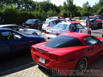 Entre los Corvette, un único Chevrolet Camaro SS, con matrícula de Hamburgo. Nunca había visto un Camaro tan cerca y lo cierto es que impresiona su diseño: es un auténtico muscle car. Un auténtico muscle car que recuerdo haber visto en el circuito, adelantándome sin esfuerzo en una recta, en la que el Suzuki no daba mucho más de sí. Llevaba caja de cambios manual, lo que implica que su motor es un 6.2 V8 capaz de desarrollar 420 agresivos caballos, en medio de un delicioso torrente aural.