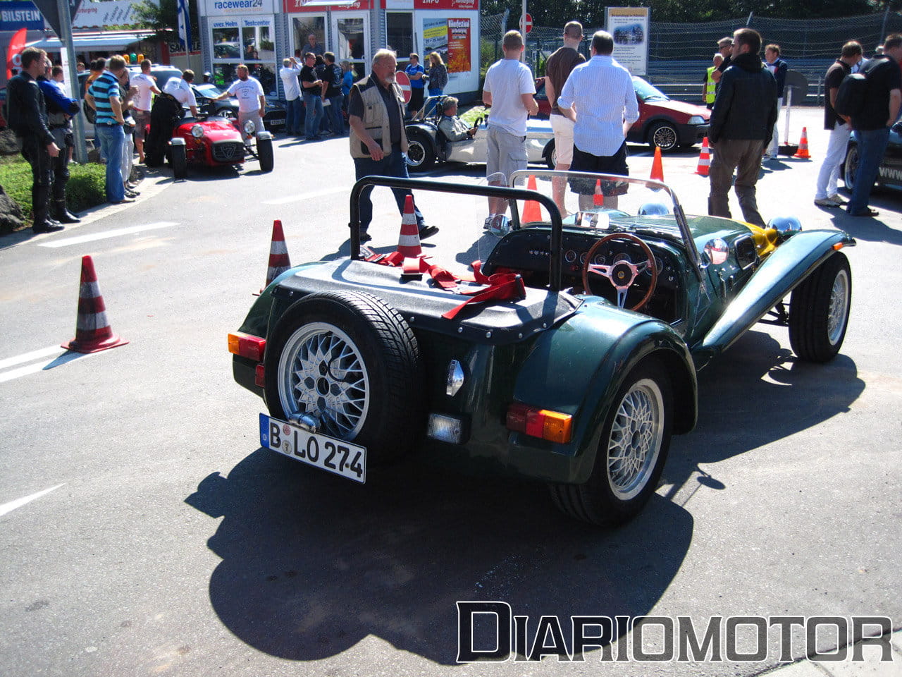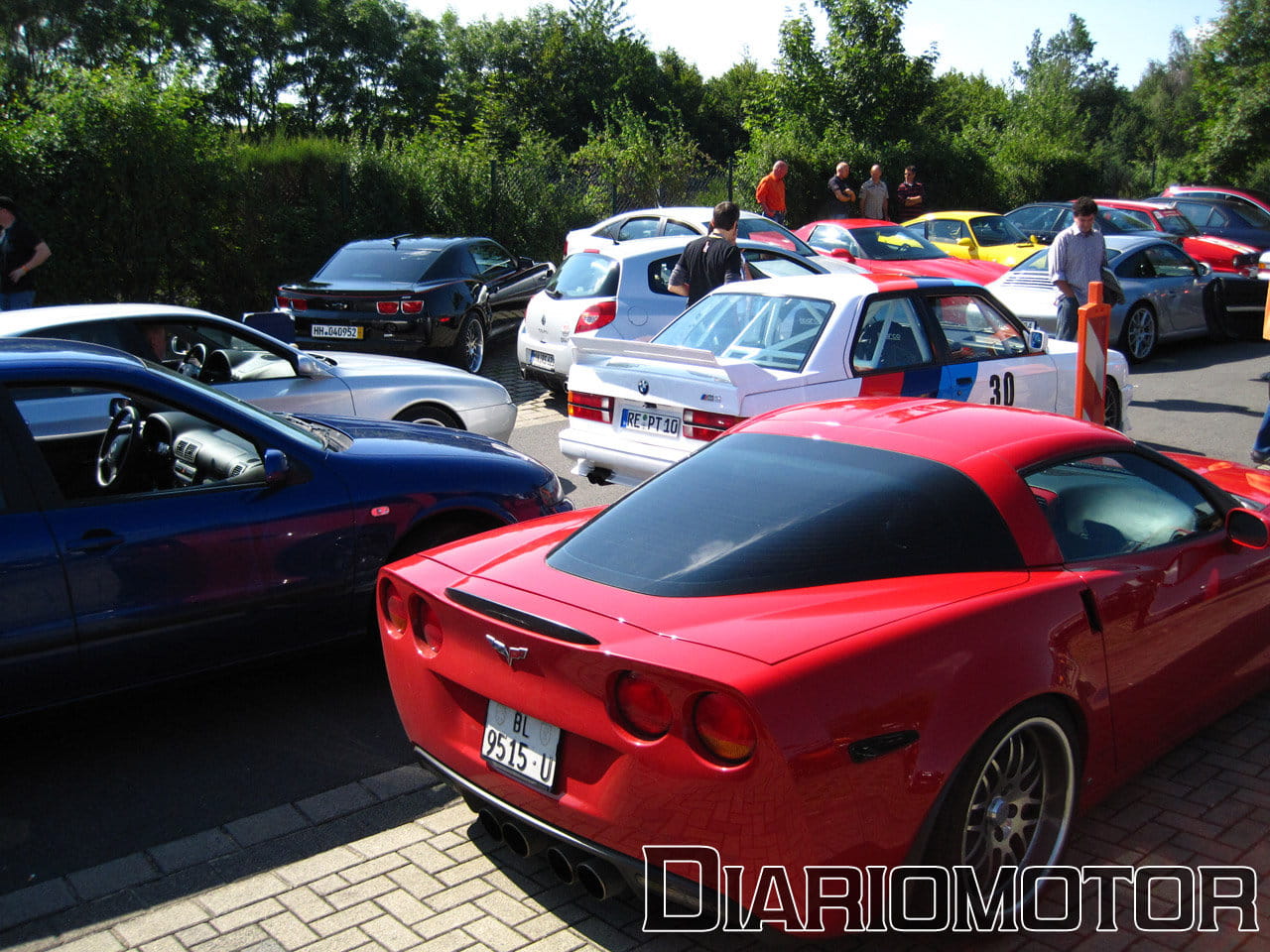 Los coches americanos no eran ajenos al Nordschleife, especialmente aquellos más deportivos y enfocados a la conducción en el circuito. La presencia de los Corvette C6 era relativamente abundante, pudimos ver al menos tres Z06, pero ni un solo ZR1. Uno de ellos llevaba una preparación dinámica interesante, con suspensiones rebajadas y un ligero ensanche. Los V8 americanos desarrollaban al menos 505 CV, extraídos sin mucha complicación de un gigantesco motor con siete litros de cilindrada.