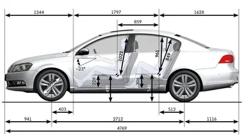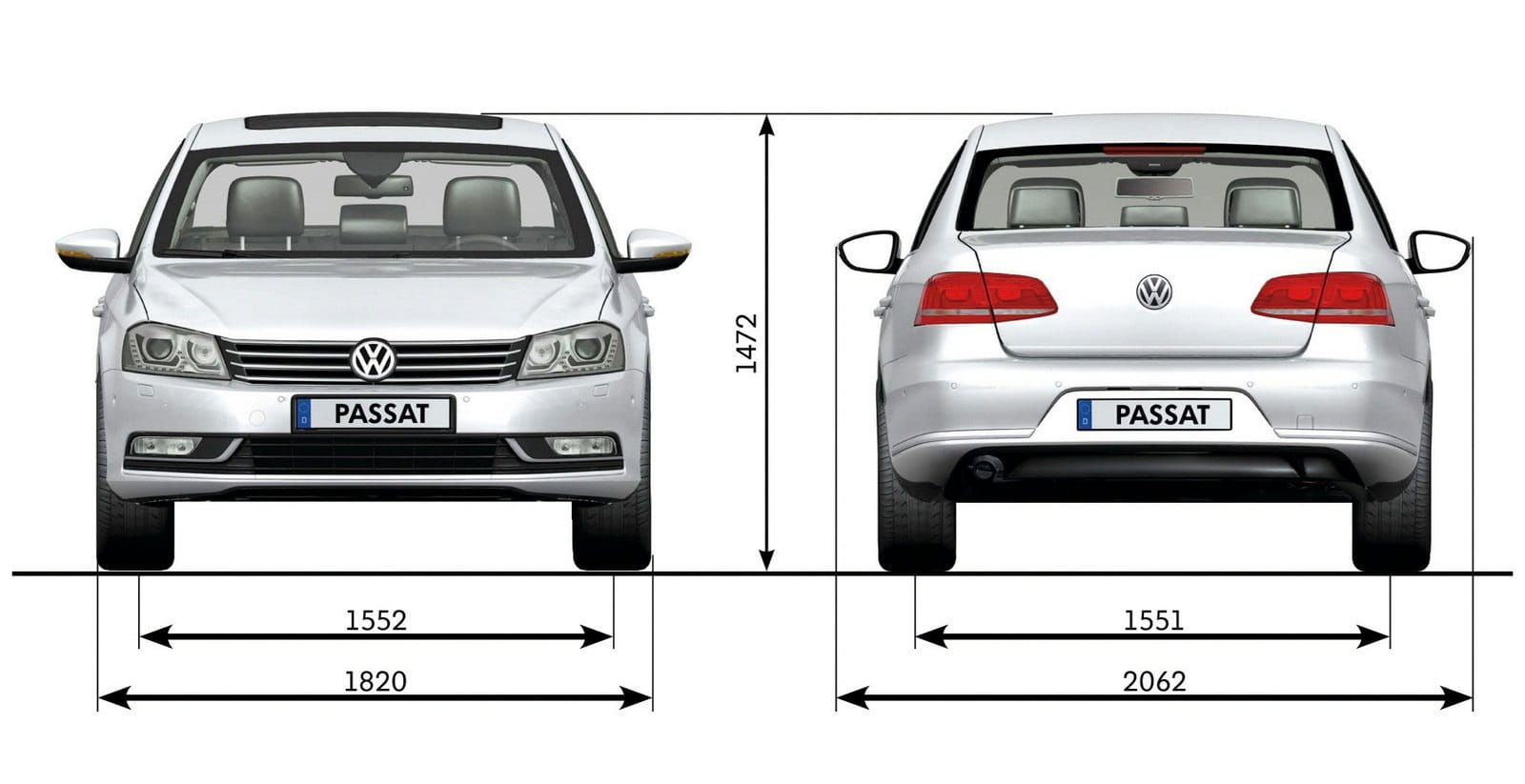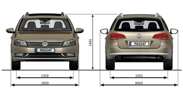 El nuevo Passat mide 4.77 metros de largo; 1.82 metros de ancho y 1.47 metros de altura. En la versión Variant o familiar, también presentada, la longitud y la altura crecen hasta 4.77 y 1.52 m respectivamente. Frente a la generación saliente, es sólo 4 mm más largo, mientras que el resto de cotas permanecen idénticas.
