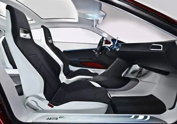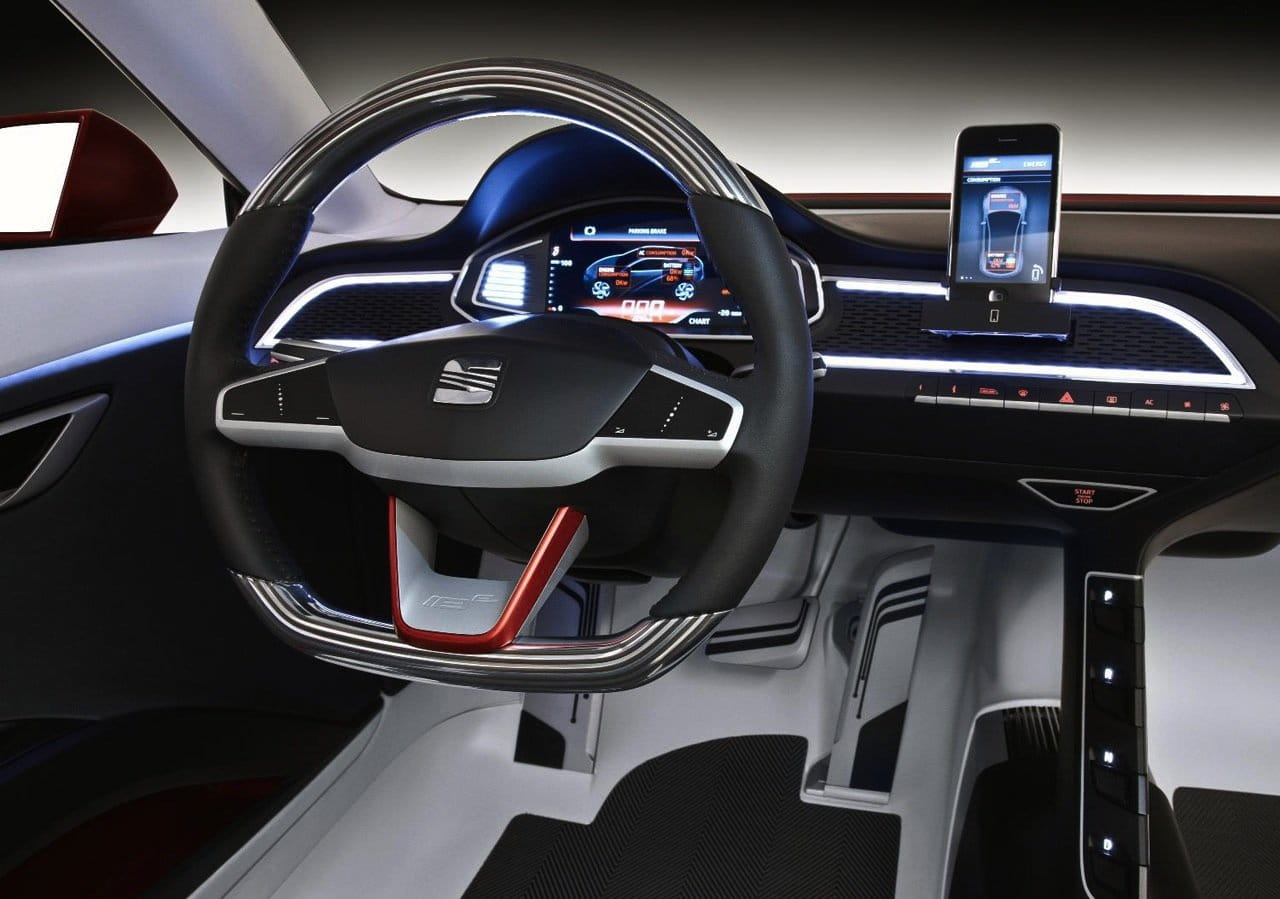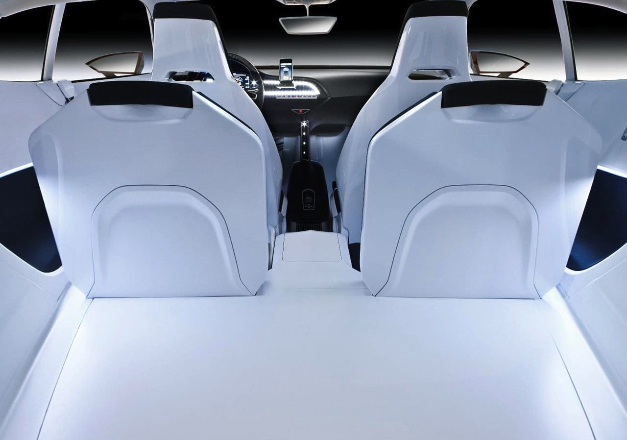 En este primer vistazo que nos permiten al interior vemos unos asientos deportivos muy originales que llegan casi hasta el techo del coche y una bitonalidad blanca y negra para casi todo el habitáculo. Lleva las formas típicas de un prototipo en cuanto a los acabados y las pantallas digitales de colores fuertes. En el centro del salpicadero existe un punto de conexión para los iPhone y iPod.