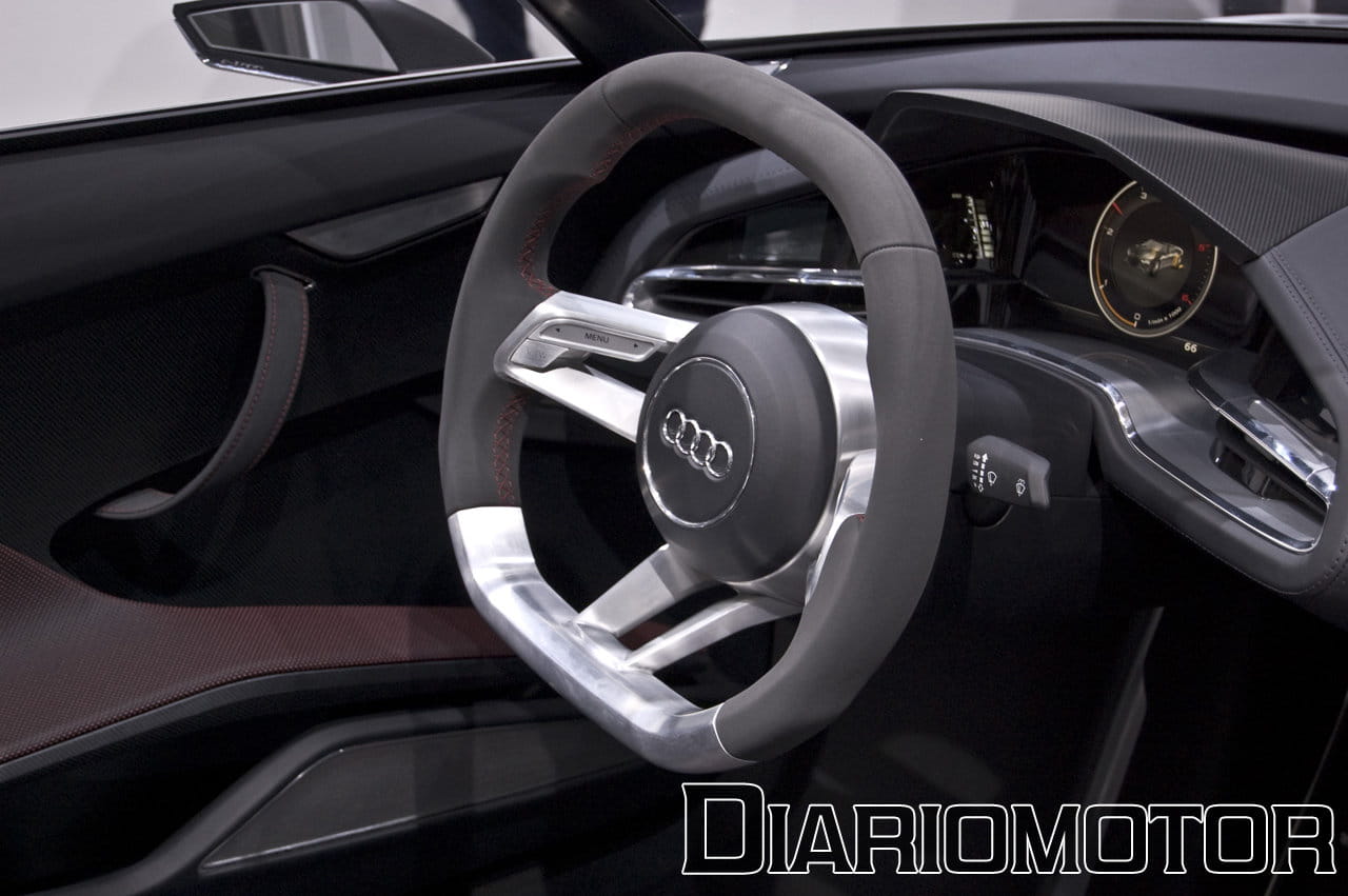 Sus proporciones son muy compactas. Hablamos de un deportivo que mide apenas 4.28 metros, prácticamente lo mismo que un Audi A3 Sportback. Pero presume de su radicalidad con sus guiños al clásico ochentero y detalles que nos recuerdan a la nueva saga de superdeportivos y prototipos de Audi. Llegados a este punto llega el momento de hablar del segundo prototipo de París, el Audi e-tron Spyder Concept.