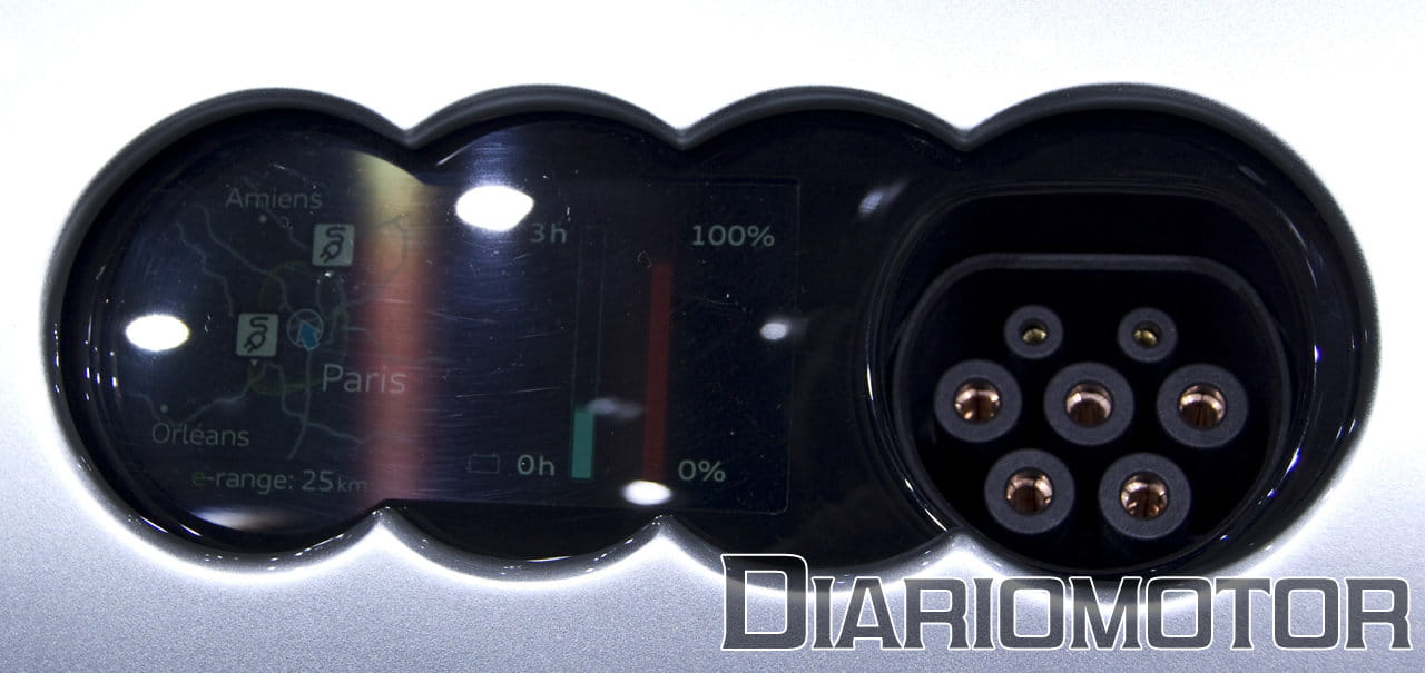 Gigantesca parrilla de laminillas cromadas, llantas deportivas y un habitáculo digno de un buen deportivo. Uno de los detalles que me resultó más curioso es el del logo de los cuatro aros sobre el capó, al pulsarlo se oculta para dejar salir un enchufe y tres indicadores con el nivel de carga de las baterías, las horas restantes para recargarla por completo y también un mapa sincronizado por GPS que indica el rango de autonomía por el que nos podemos mover.