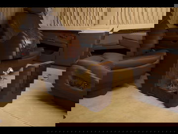 Lo cierto es que aunque su aspecto exterior sea algo hortera, el interior tiene un nivel de lujo increíble. Hay dos configuraciones posibles, una de ellas con tres “asientos VIP” y otra con cuatro gigantescas poltronas. En esta última configuración los pasajeros de la última fila dispondrán de todo un armario entre sus asientos, donde poder almacenar hasta 17 litros en una nevera. Los asientos de cuero tienen regulación eléctrica y soporte extensible para el confort supremo de las piernas.