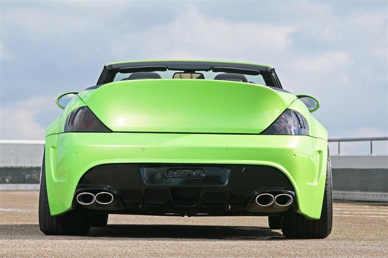 Lo que es el kit de carrocería en sí, está formado por prominentes faldones y unos paragolpes que casi alcanzan el suelo. En el caso del paragolpes trasero, integra una especie de difusor únicamente con función estética. Este kit de carrocería cuesta la friolera de 5.950 euros, y en ninguna parte se dice que el color verde radioactivo esté incluido en el precio. El spoiler situado en el portón del maletero – con supresión de logotipos – se encarga aparte, y cuesta 395 euros. Tiene puertas tipo Lamborghini.