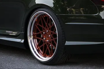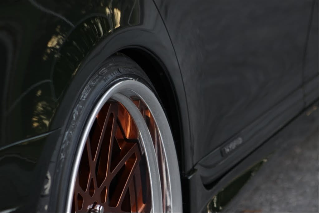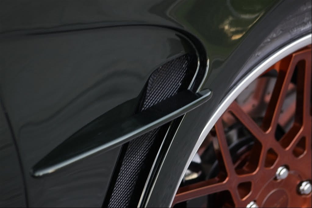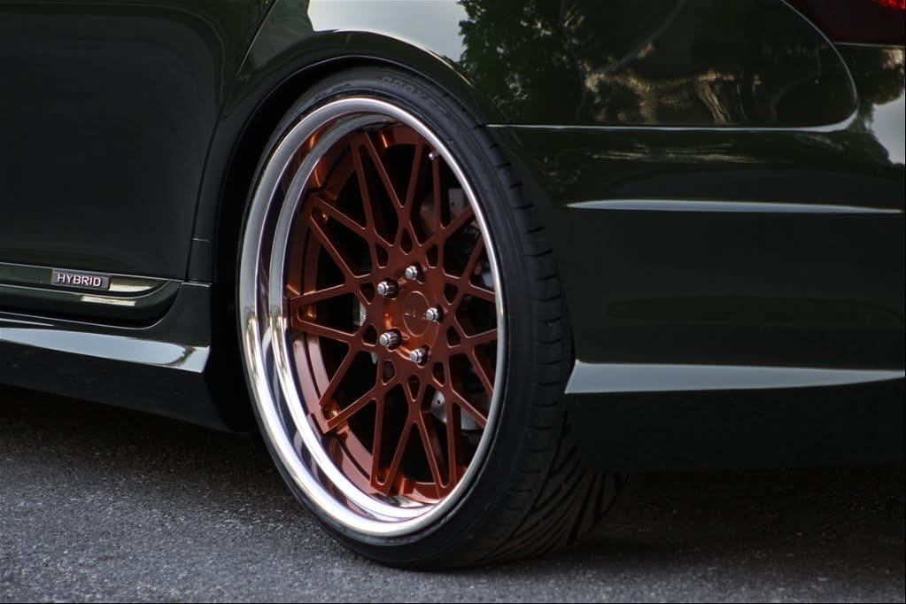 La estética rompedora continúa por los faldones realizados en fibra de vidrio o los alerones traseros y termina en las llantas de aleación, todo un ejemplo de poca discrección con su color rojizo Candy Cooper y sus 20 pulgadas de diámetro. Aunque cueste verlo en algunas imágenes la carrocería de LS híbrido está pintada en color verde oscuro Glacier Green.